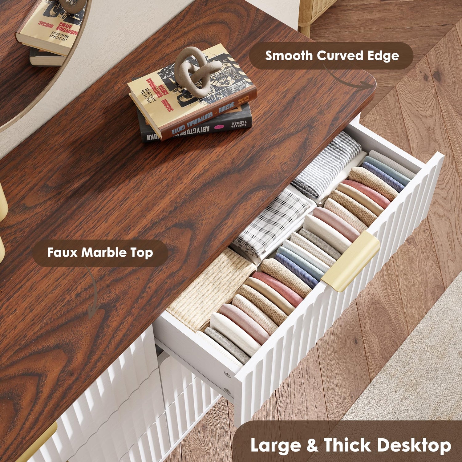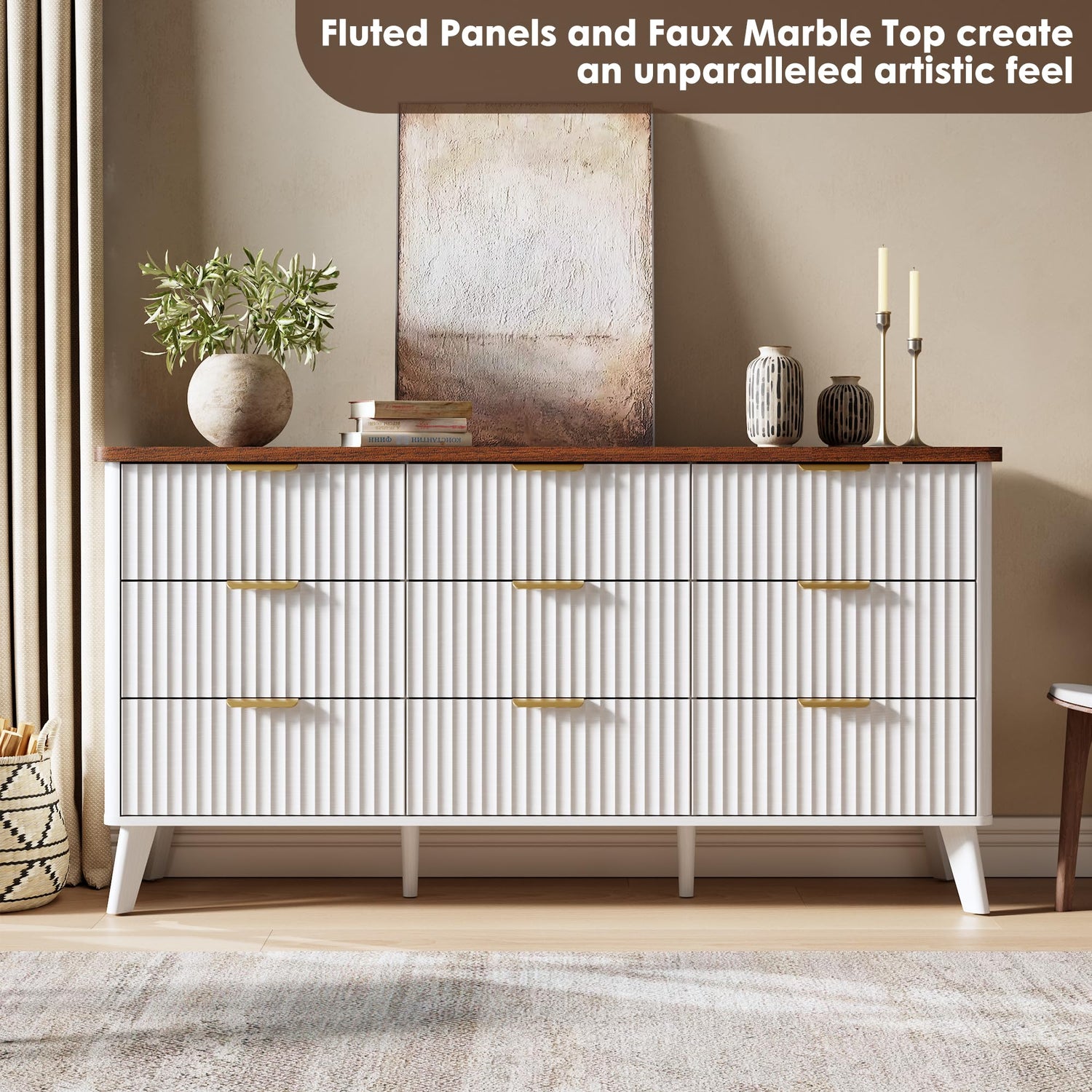 Garvee 9 Drawers Dresser for Bedroom, 60.6" Wide Dressers with Curved Profile Design, Fluted Wood Drawers with Gold Handle, Modern Chest of Dressers with Thickened Design for Living Room, White