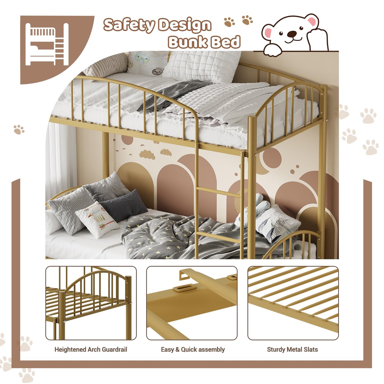 Garvee Bunk Bed Twin Over Twin with Ladder and Arched Guardrail, Heavy Duty Bunkbeds Frame with Sturdy Steel Slats Support for Kids Boys Girls, Space-Saving, No Box Spring Needed, Gold