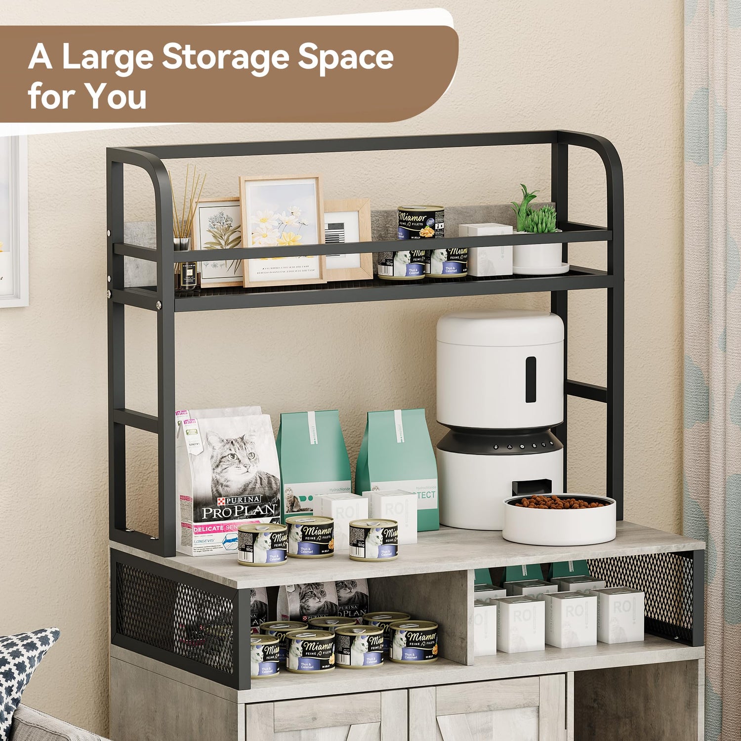 - Ample Functional Storage: With removable open shelves and two compartments, this cat litter box furniture provides convenient storage for cat supplies, toys, or personal items, keeping everything neat and easily accessible
