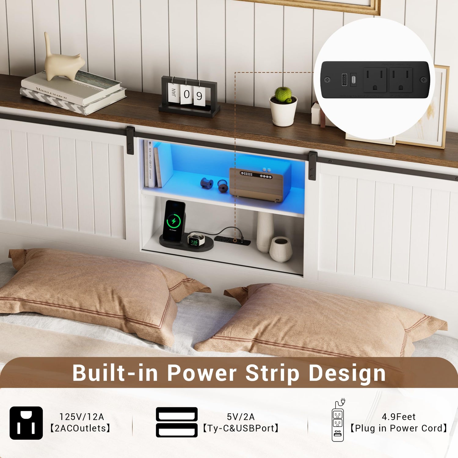 Details: Garvee Farmhouse Full Size Bed Frame with Storage, Farmhouse Bed Frame with Charging Station and Led Light, Bed Frame with Sliding Barn Door, Noise Free, No Box Spring Needed, Easy Assembly