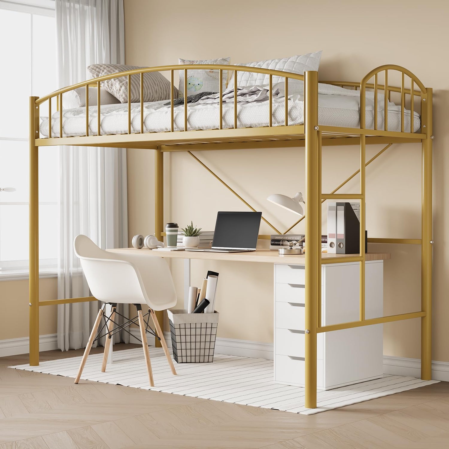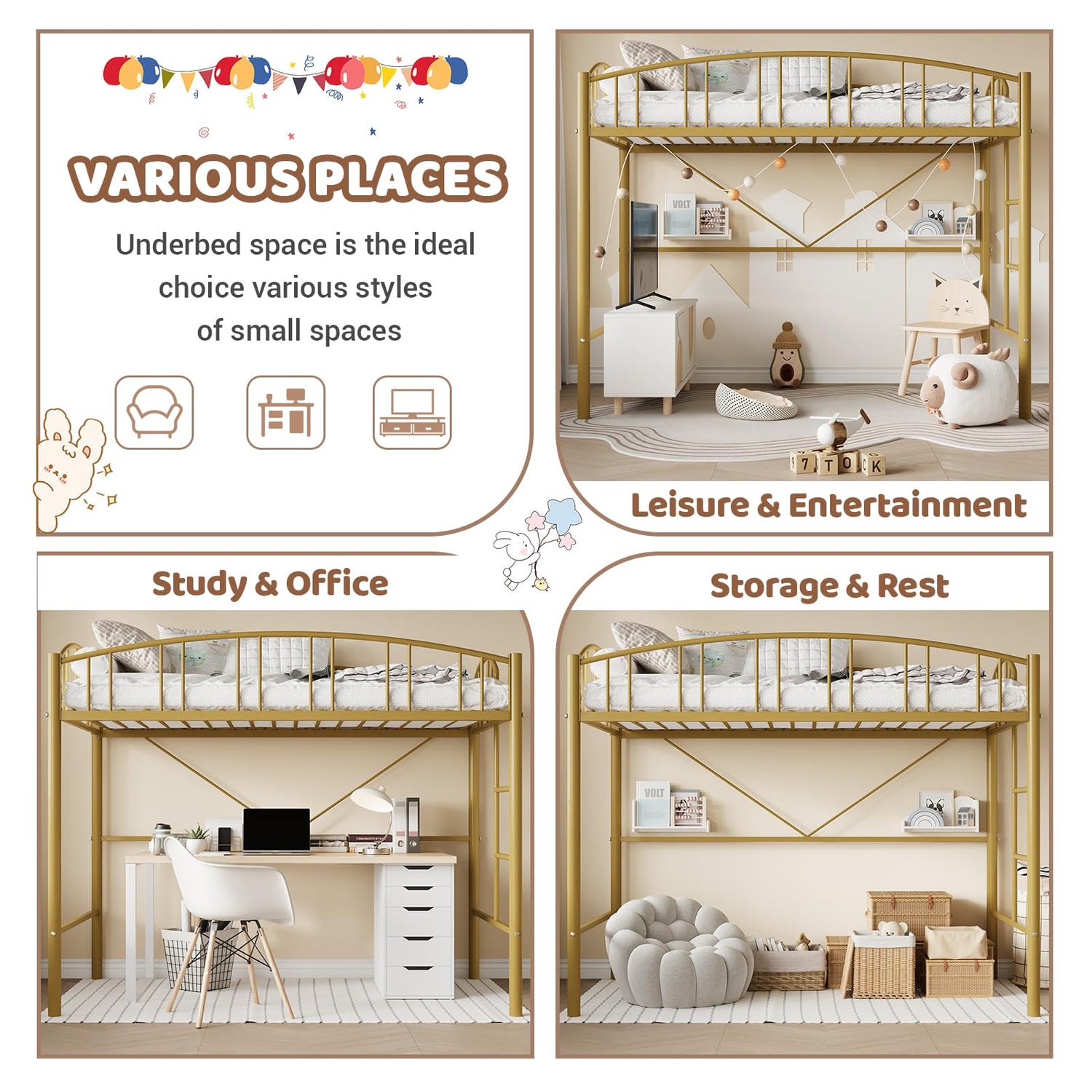 Garvee Loft Bed Twin Size with Ladde and Arched Guardrail, Heavy Duty Metal Loft Bed Frame for Kids and Adults, Sturdy Steel Slats Support, Small Space Saving Design, No Box Spring Needed, Gold