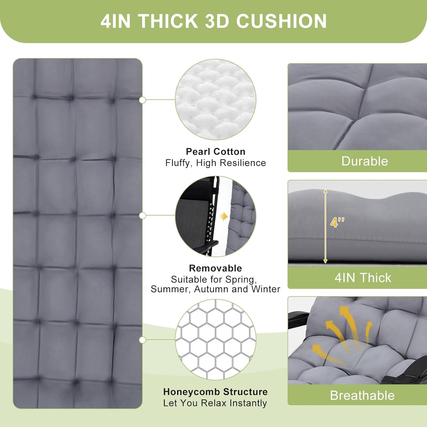 - 4" Thick Removable Cushion: Enjoy luxury comfort with a plush 4" seat cushion that detaches effortlessly for breathable airflow on hot days or stays on for cozy warmth in cooler weather. The double layer fabric resists wear, making these zero lounge chairs perfect for year round use ideal for patio naps, poolside lounging, or indoor relaxation.