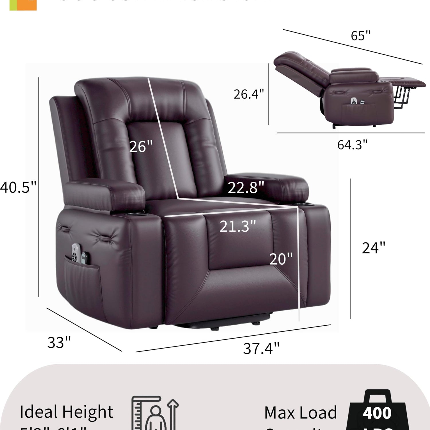 - 【Product Dimensions】The Power Lift Recliner Chair measures 38.6 x 37.4 x 40.6 in, seat width: 21.3 in, weight capacity:400 LBS, making it a sturdy and spacious choice for seniors and those with limited mobility