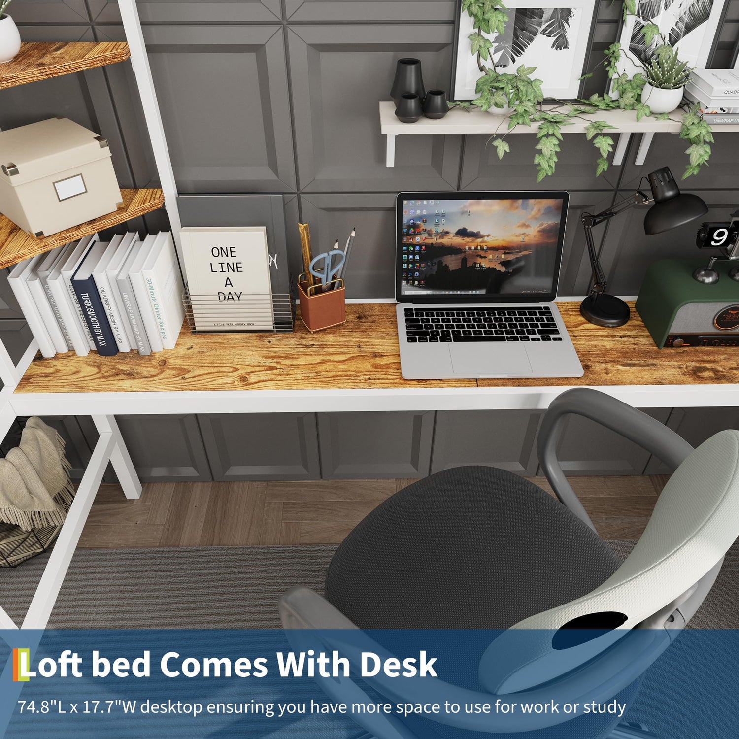- 【Large Desk and Ample Storage Solutions】Work or study comfortably at the spacious 74.8"L x 17.7"W desk, which easily accommodates computers, books, and supplies. Two corner triangular storage shelves provide dedicated space for decor, photos, or essentials, adding personality and organization to your room. This loft bed with storage shelves ensures everything is within reach while maintaining a clutter-free environment.