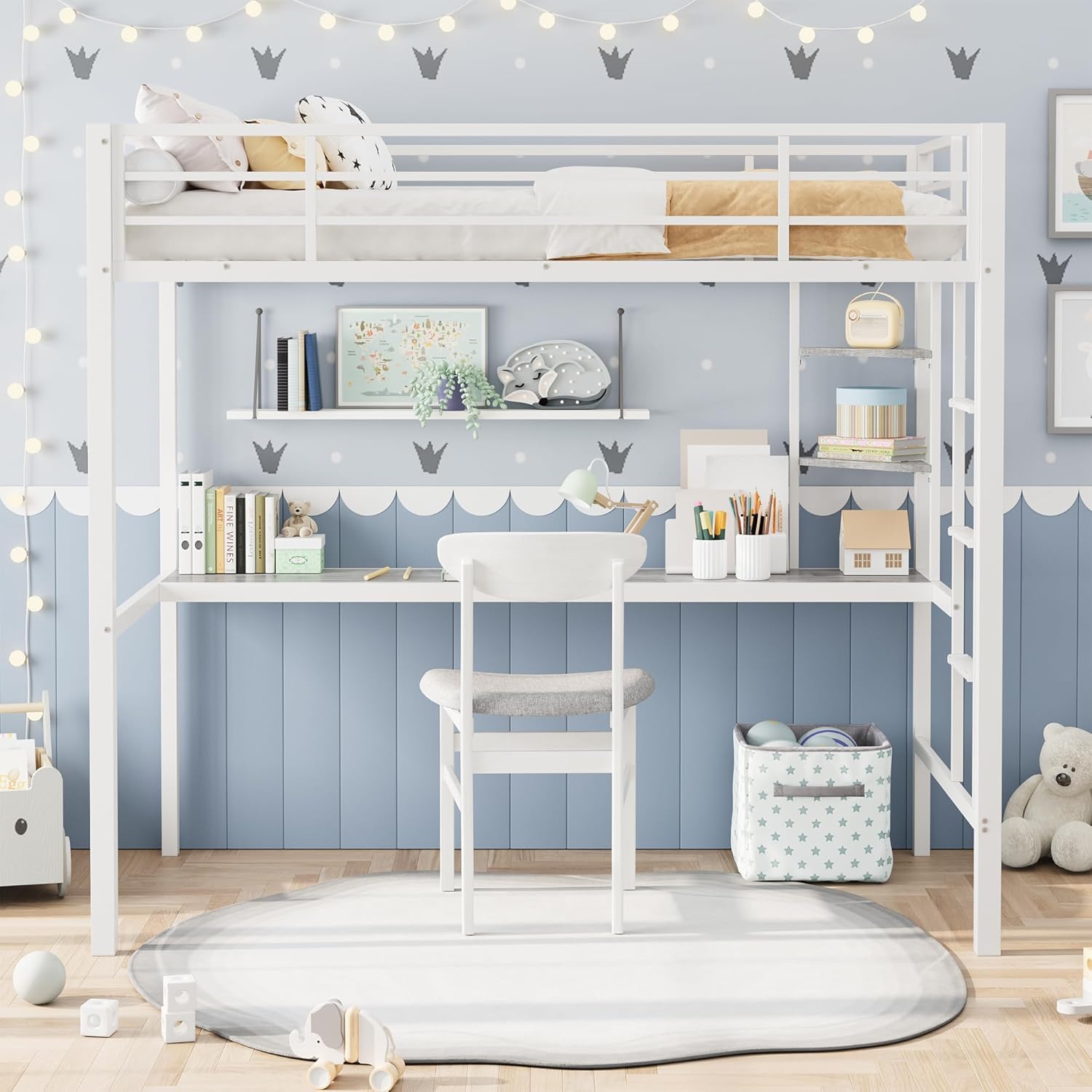 - 【Space-Saving Loft Bed】This heavy-duty metal loft bed integrates a twin bed, large desk, and 2-tier storage shelves into one compact unit, perfect for small apartments or bedrooms. It maximizes vertical space by combining sleeping, working, and storage areas, eliminating the need for separate furniture. Ideal for kids and adults, this space-saving design enhances functionality without compromising on style or comfort.