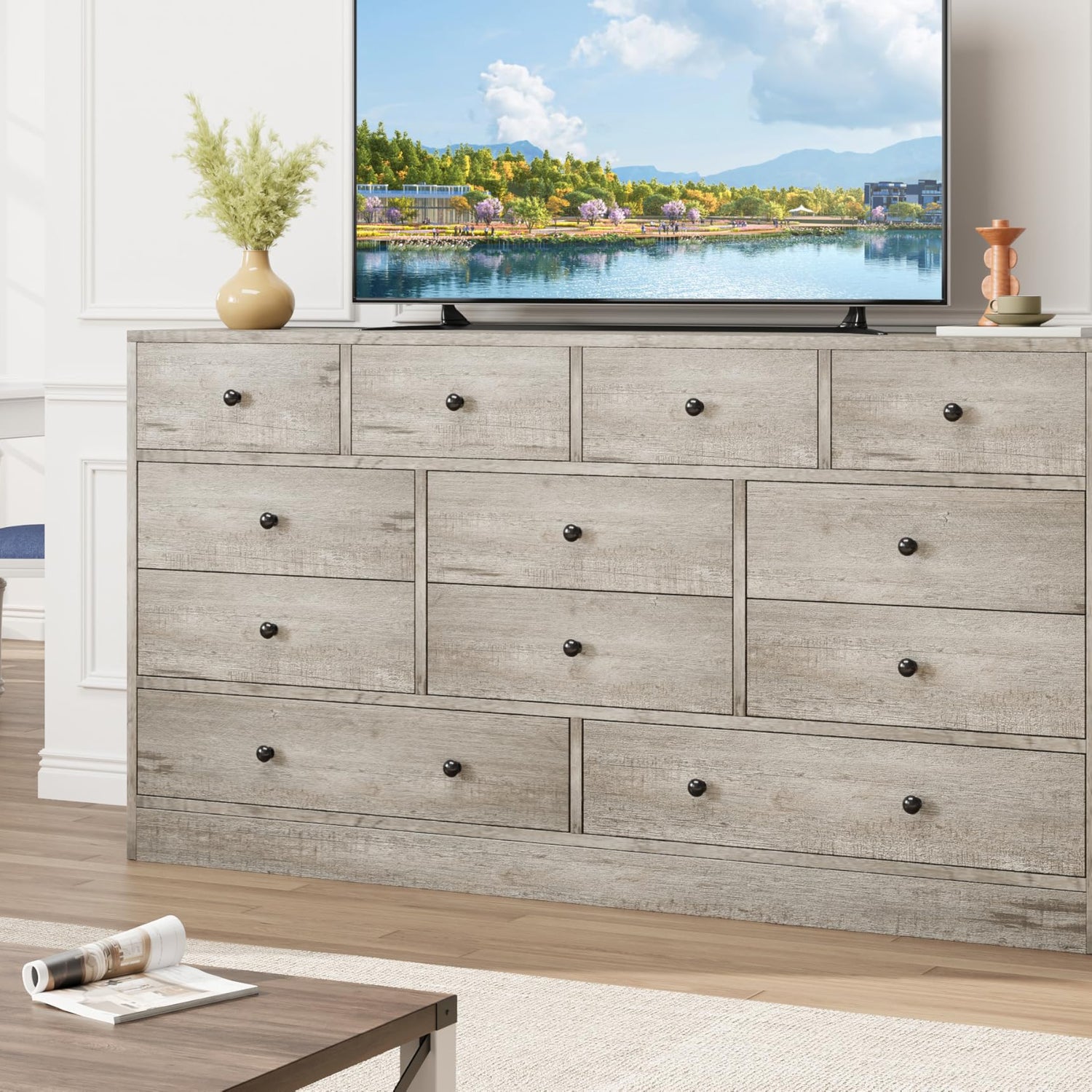 - 【Spacious Storage】This bedroom dresser chest of drawers has 4 small drawers 6 spacious medium drawers, and 2 large drawers, providing plenty of storage space for your clothes, toys, skincare products, towels or other personal items. the larger dresser tabletop size is far larger than others, 61 inches wide tabletop can easily hold keys, alarm clocks, photo frames, potted plants, and other daily necessities, and doubles as a large storage cabinet and TV stand.