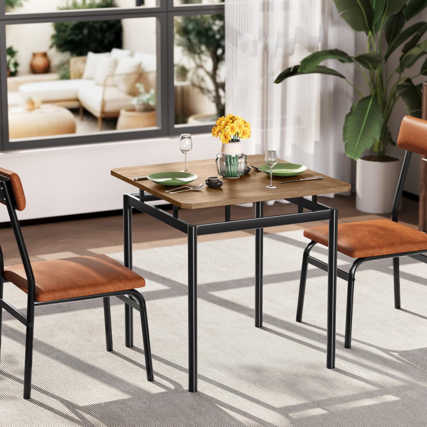 GarveeHome 3 Piece Dining Table Set, Wooden Kitchen Table Set with 2 PU Upholstered Chair, Industrial Metal Frame Dinette Set for Dining Room, Home Dinner, Party (Brown, 2 Chairs)