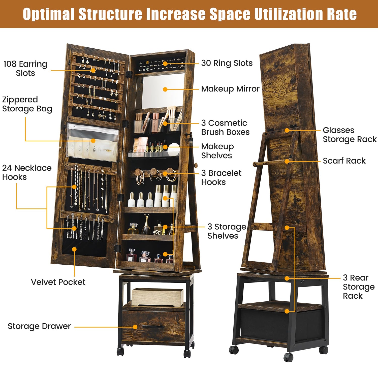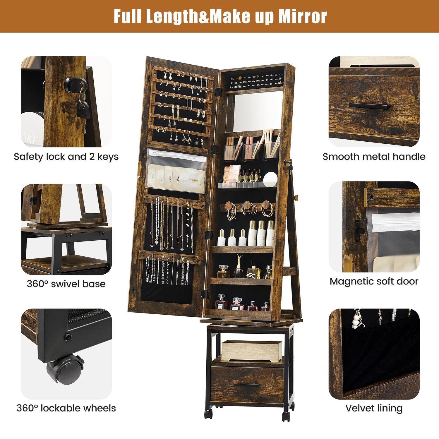 GarveeHome 360° Swivel Jewelry Cabinet, 66'' Freestanding Jewelry Armoire With Bottom Drawer, Lockable Full-Length Mirror With Rear Storage Shelves, Jewelry Armoire Organizer, Retro Brown