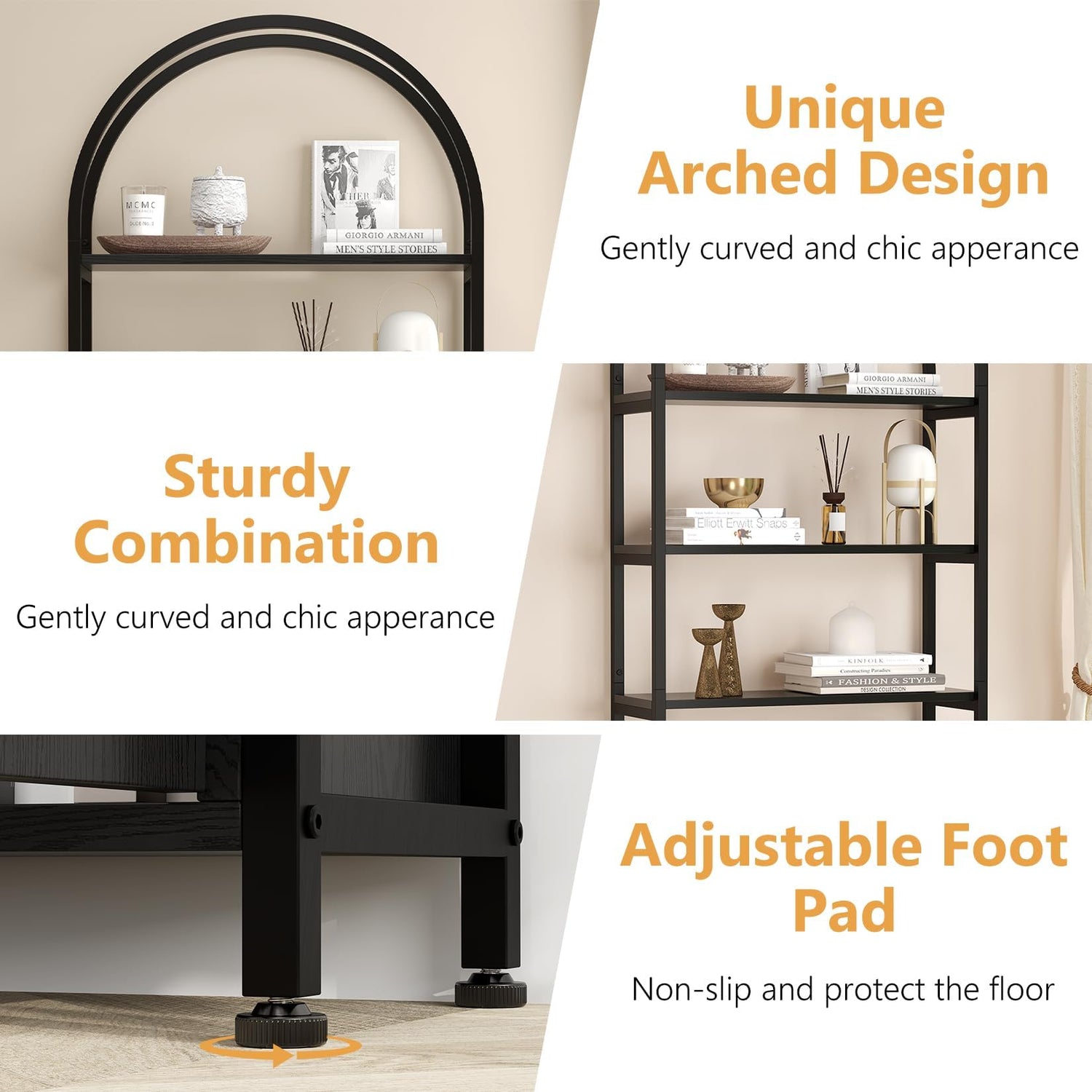 - Arched shaped: Elevate your space with this 4 tier bookshelf with doors storage, featuring a unique arched bookshelf design that complements any modern decor. This round bookshelf adds a touch of sophistication to your living room or office. Perfect for those seeking a stylish and functional arch bookcase.