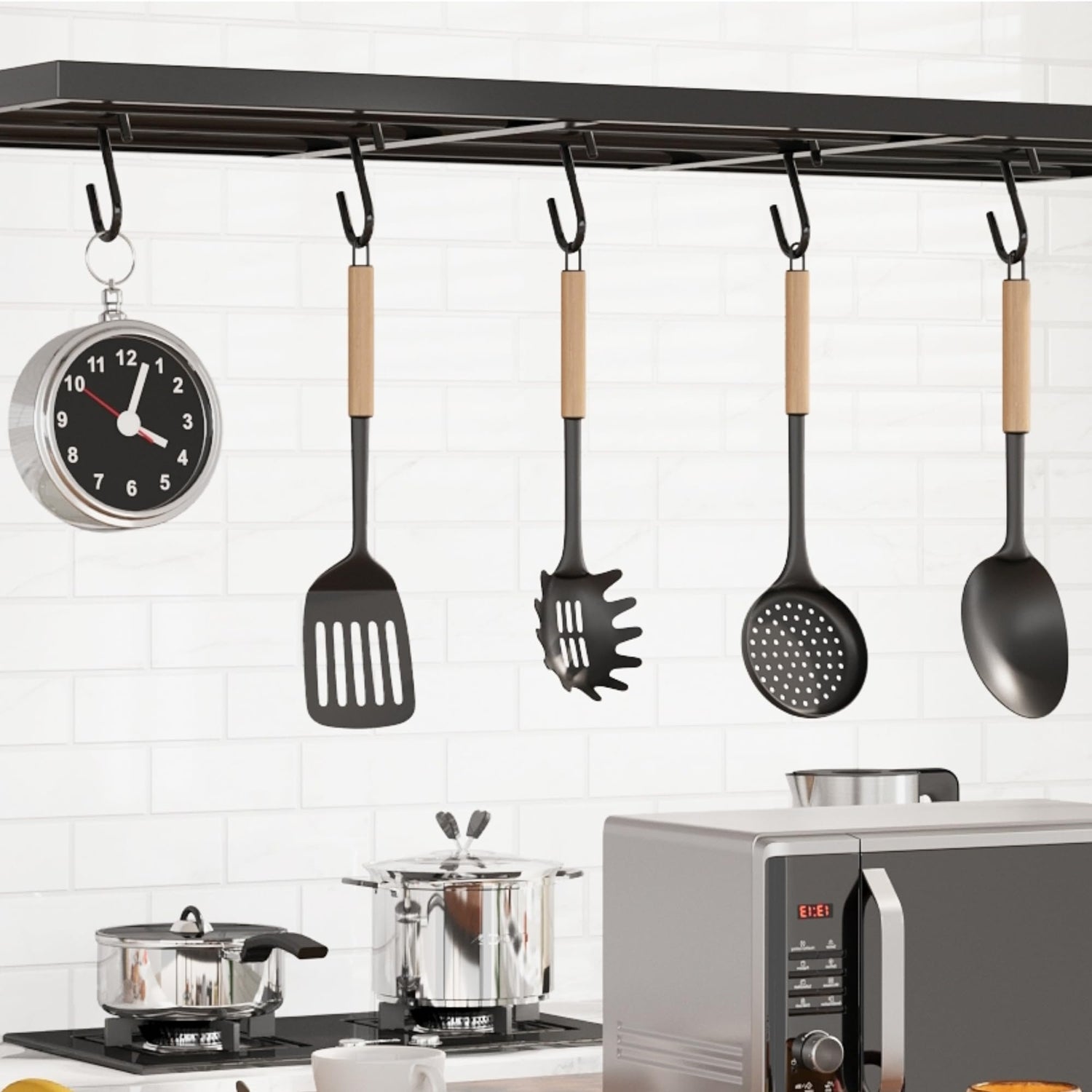 - 3 Tier Storage & 5 Hooks: kitchen island with power outlet With spacious open shelves, you have plenty of room to store your pots, pans, kitchen utensils, microwave, toaster, and other small appliances. The 5 S hooks are ideal for hanging cooking tools, spoons, pans, or kitchen towels, keeping your kitchen organized and efficient