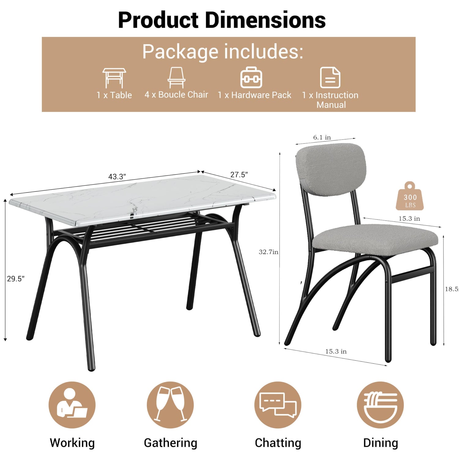 - 【Space-Efficient Configuration】Table Dimensions: 43.3"L x 27.5"W x 29.5"H (200 lb capacity) Chair Dimensions: 15.3"L x 16.1"W x 32.7"H (300 lb capacity) Designed for compact living, all four chairs conveniently slide beneath the table - an ideal solution for apartments, small kitchens, or cozy dining nooks.
