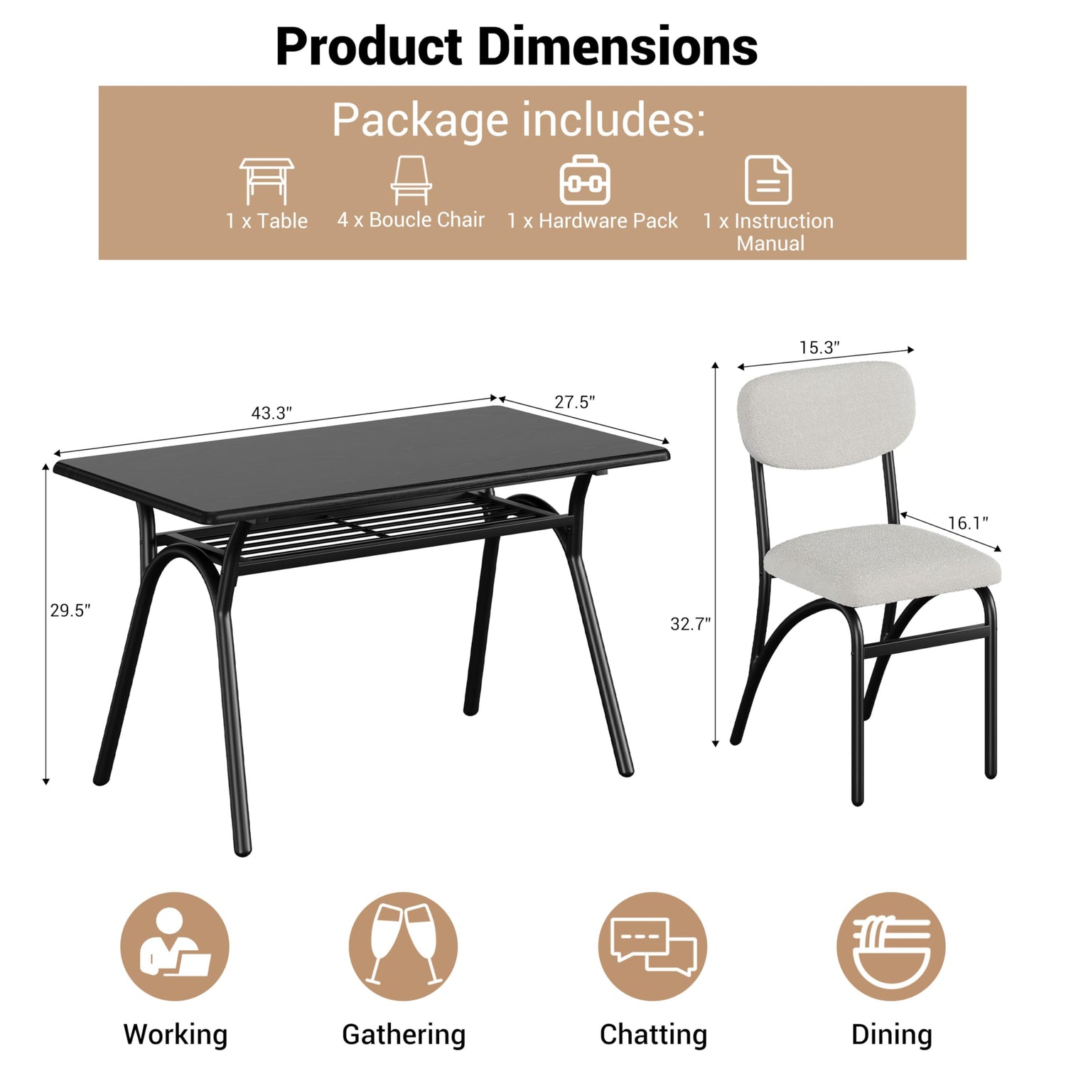 - 【Space-Efficient Configuration】Table Dimensions: 43.3"L x 27.5"W x 29.5"H (200 lb capacity) Chair Dimensions: 15.3"L x 16.1"W x 32.7"H (300 lb capacity) Designed for compact living, all four chairs conveniently slide beneath the table - an ideal solution for apartments, small kitchens, or cozy dining nooks.