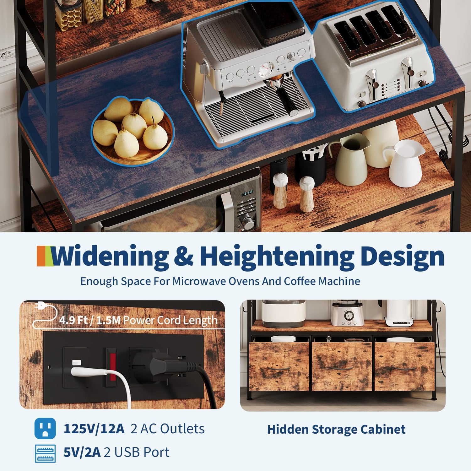 GarveeHome 5 Tier Kitchen Bakers Rack with Charging Station & Drawers, Industrial Microwave Oven Stand, Freestanding Farmhouse Coffee Bar Station Utility Shelves with Hooks, Vintage Brown