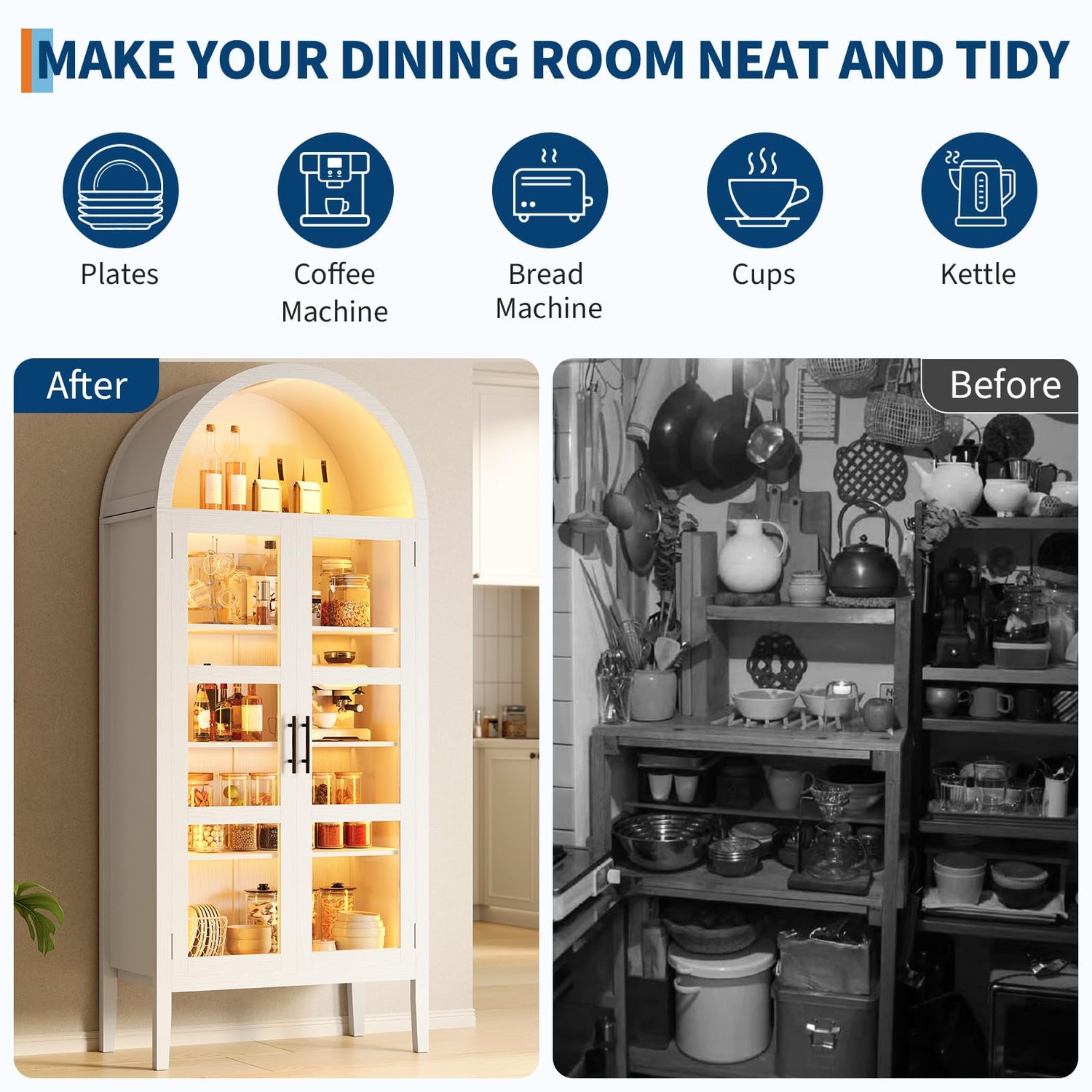 - 【Elegant Arched Design】The pantry cabinet featuring a charming arched top, stunning blend of design and practicality. Two tempered glass doors not only provide easy visibility but also let you display your favorite items while keeping them safe and dust-free, with clear acrylic side panels for improved visibility and durability.