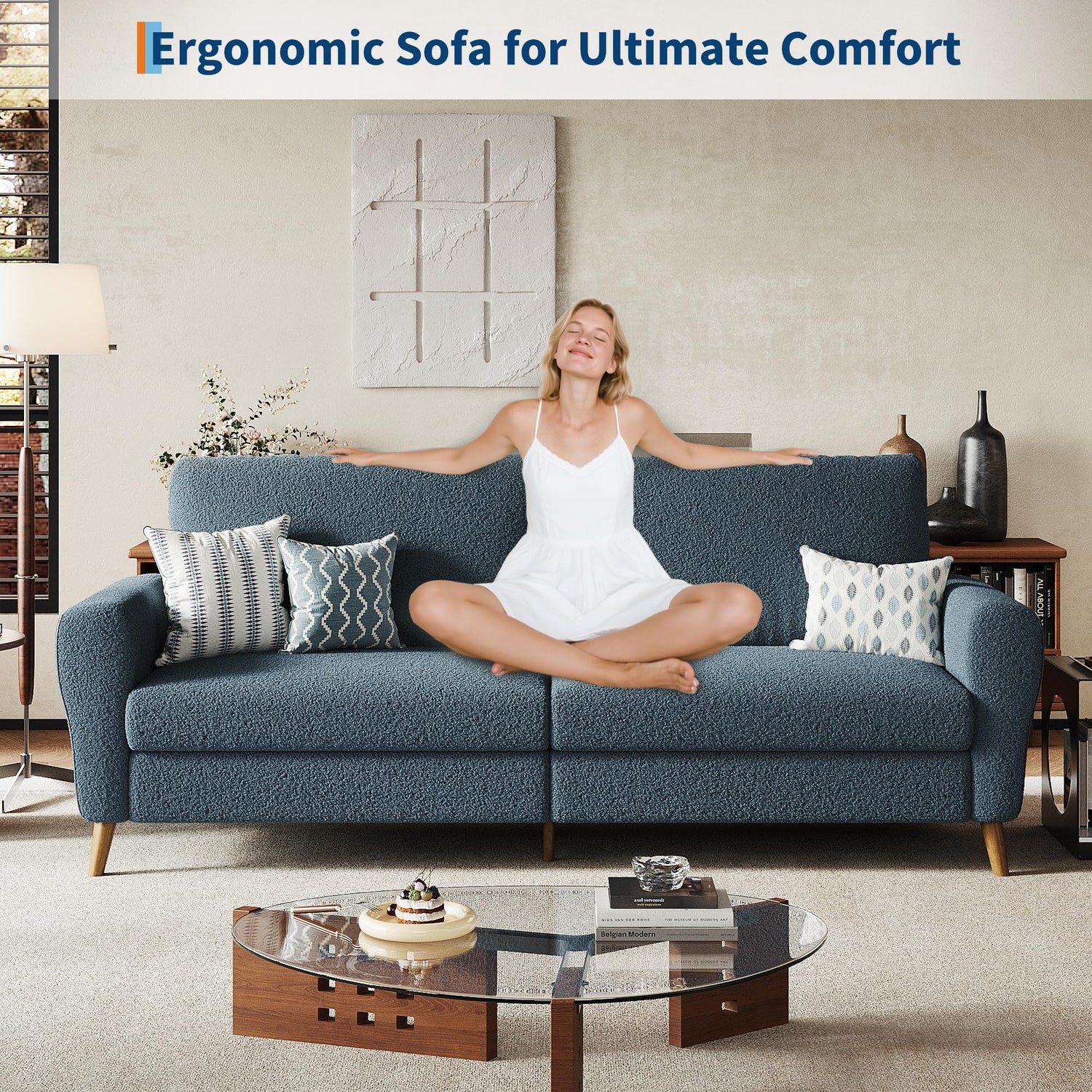 - Ergonomic Mid-Century Modern Design: Thoughtfully crafted with gently curved, streamlined armrests and an elegantly contoured silhouette, this modern couch offers ergonomic support that promotes comfortable seating posture. The chic boucle upholstery and sturdy wooden legs infuse your space with timeless mid-century charm and inviting style—perfect for relaxing in both comfort and sophistication.