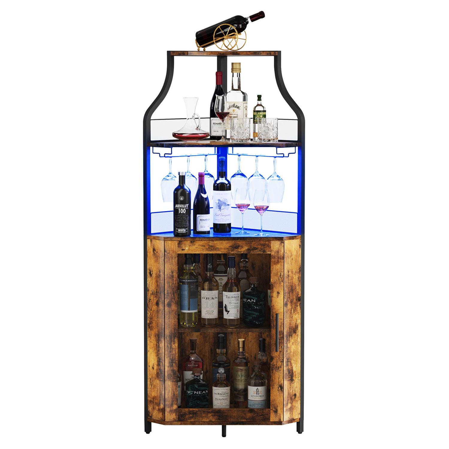 GarveeHome Corner Bar Cabinet with LED Lights, Industrial Liquor Cabinet with Adjustable Shelf, 5-Tier Industrial Wine Cabinet with Glass Holder, Home Bar Cabinet, Coffee Bar Cabinet, Rustic Brown