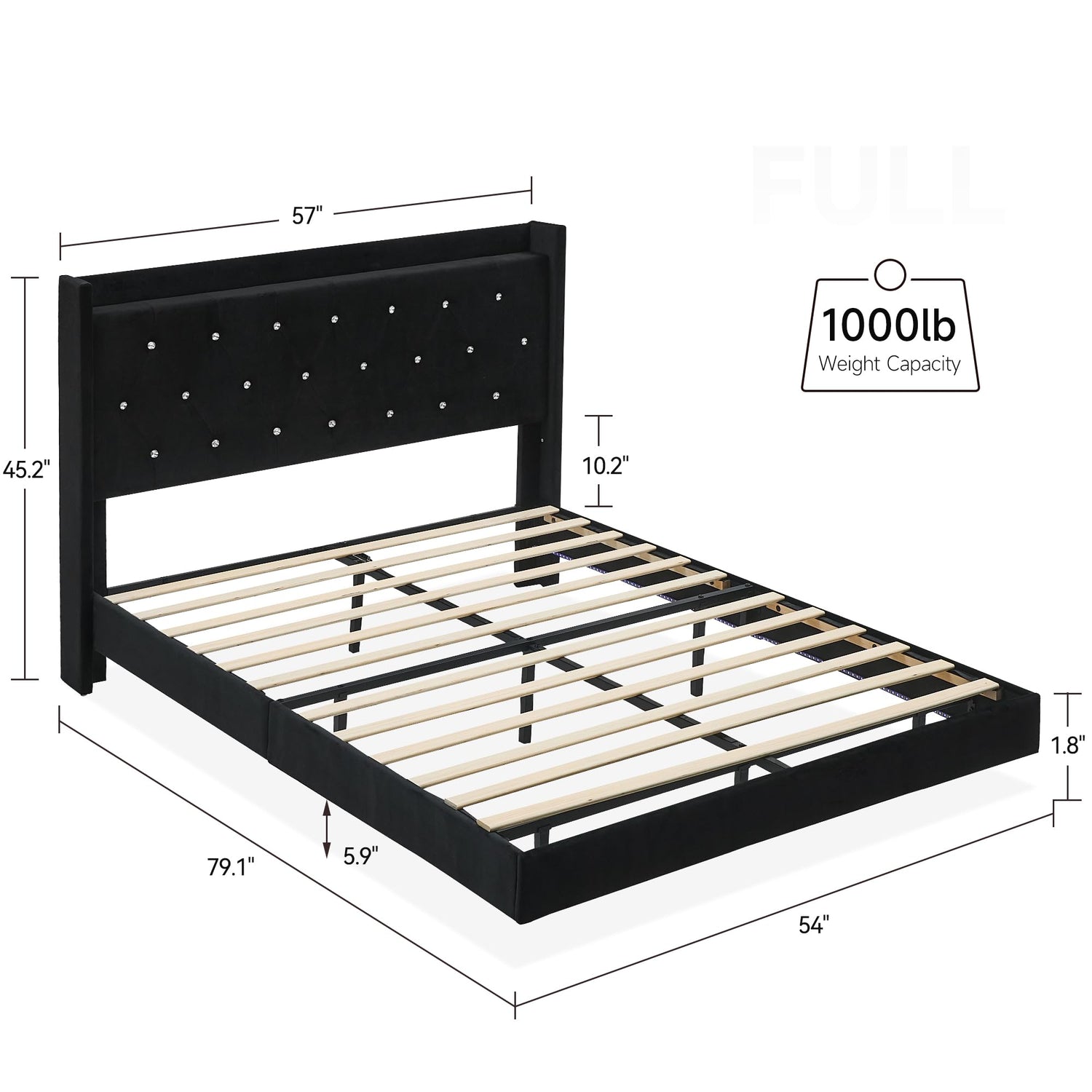 Introducing the GarveeHome Full Size Floating Bed Frame, a perfect blend of modern elegance and practical functionality. This full-size bed frame features a stunning floating design, supported by internal legs on the frame footboard, creating the illusion of levitation in your bedroom. The wingback design, adorned with crystal button accents, adds a touch of sophistication, making it a stunning centrepiece in any space.