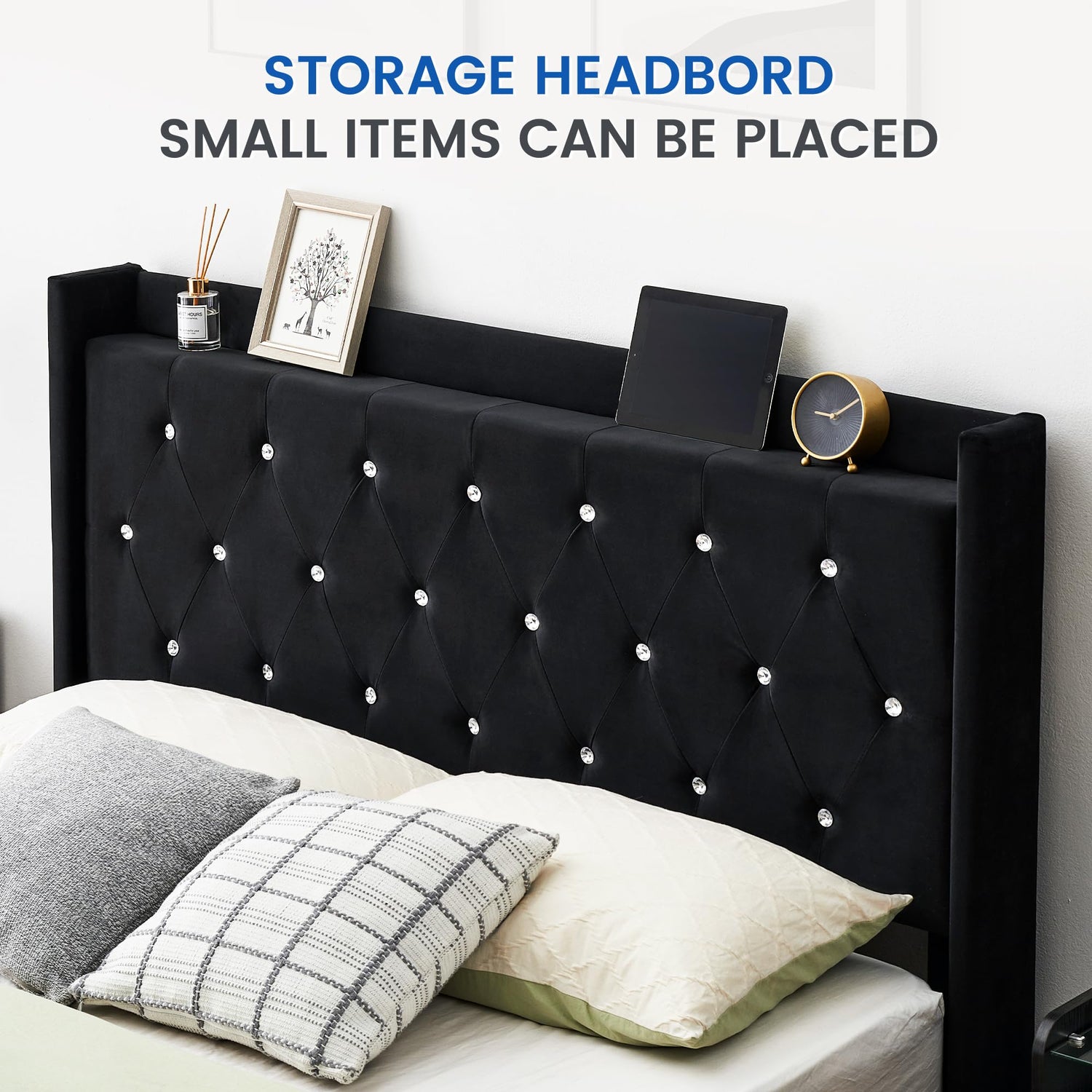 GarveeHome Full Size Floating Bed Frame with LED Lights and Wingback Storage Headboard, Black