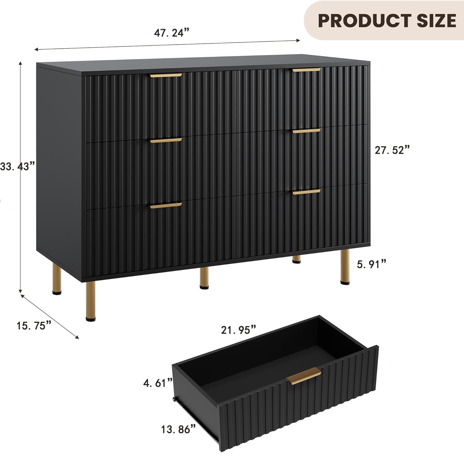 - Luxurious & Elegant Design: Fluted 6 drawer dresser for bedroom is a true masterpiece in design, functionality, and luxury. Black 6 drawer dresser for bedroom with fluted design panels and gold leg support design offers the perfect combination of style and convenience. Modern bedroom dressers will look great whether used as a chest of drawers, or TV stand.