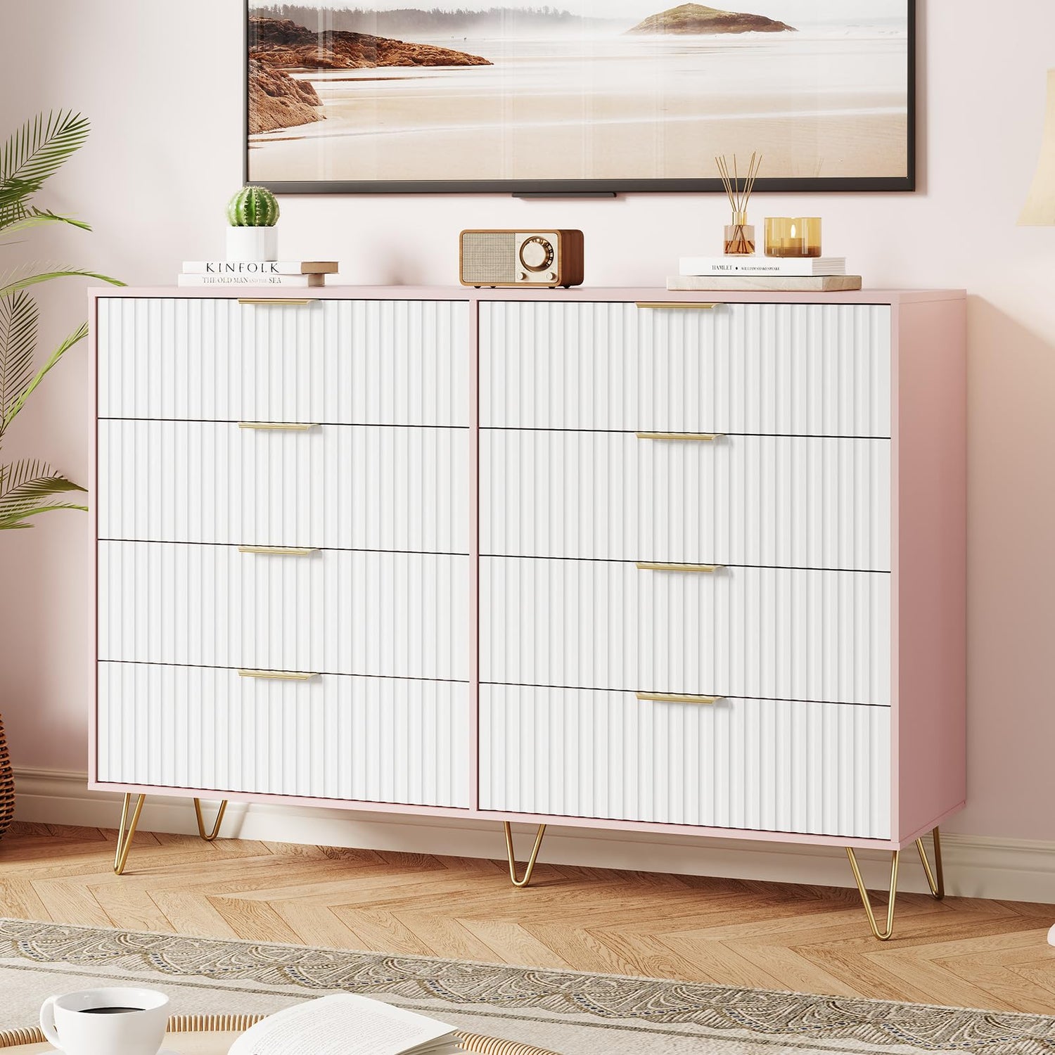 GarveeHome Fluted Dresser for Bedroom with 8 Drawers,55" Wide Modern Chest of Wooden Bedroom Chest with Metal Handle,Clothes Storage Organizer,Dresser & TV Stand for Living Room,PIink