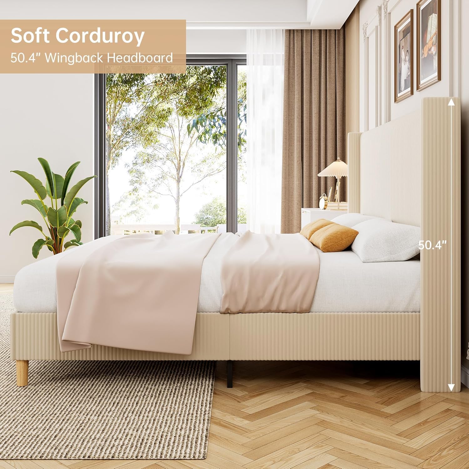 - Modern & Elegant - This beige bed frame is designed in a contemporary wingback headboard, smooth corduroy, and soft sponge wrap the entire bed frame, adding sophisticated style to any bedroom.