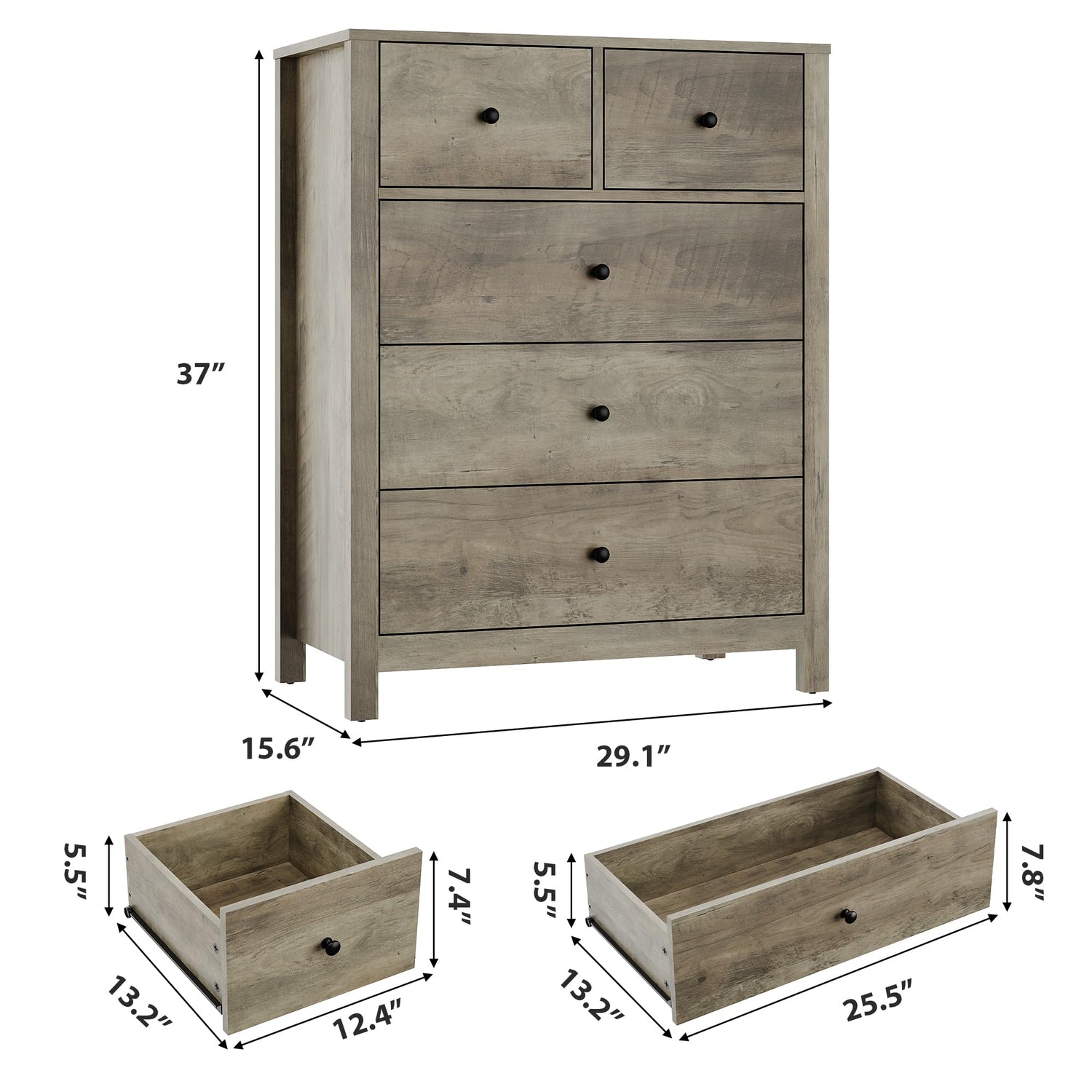 - 5-Drawer Tall Grey Dresser: This contemporary dresser measures 15.6"D x 29.1"W x 37"H and features 5 spacious drawers, each with a depth of 5.5 inches. It’s perfect for organizing clothing, documents, jewelry, and personal belongings. The expansive tabletop offers ample space for lamps, picture frames, plants, and decorative accents. Streamline your living area, keep things tidy, and add a touch of warmth to your room