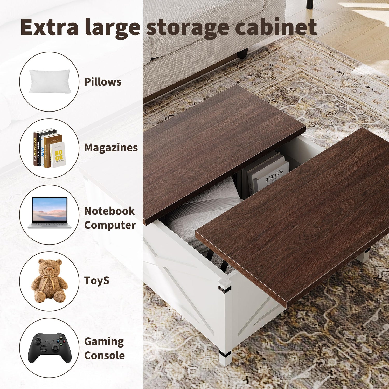 - 【Ample & Smart Hidden Storage】:Under the lift top, discover a spacious hidden storage compartment . It's perfect for organizing and hiding away remotes, magazines, blankets, toys, or board games, helping you maintain a clean and tidy living room.