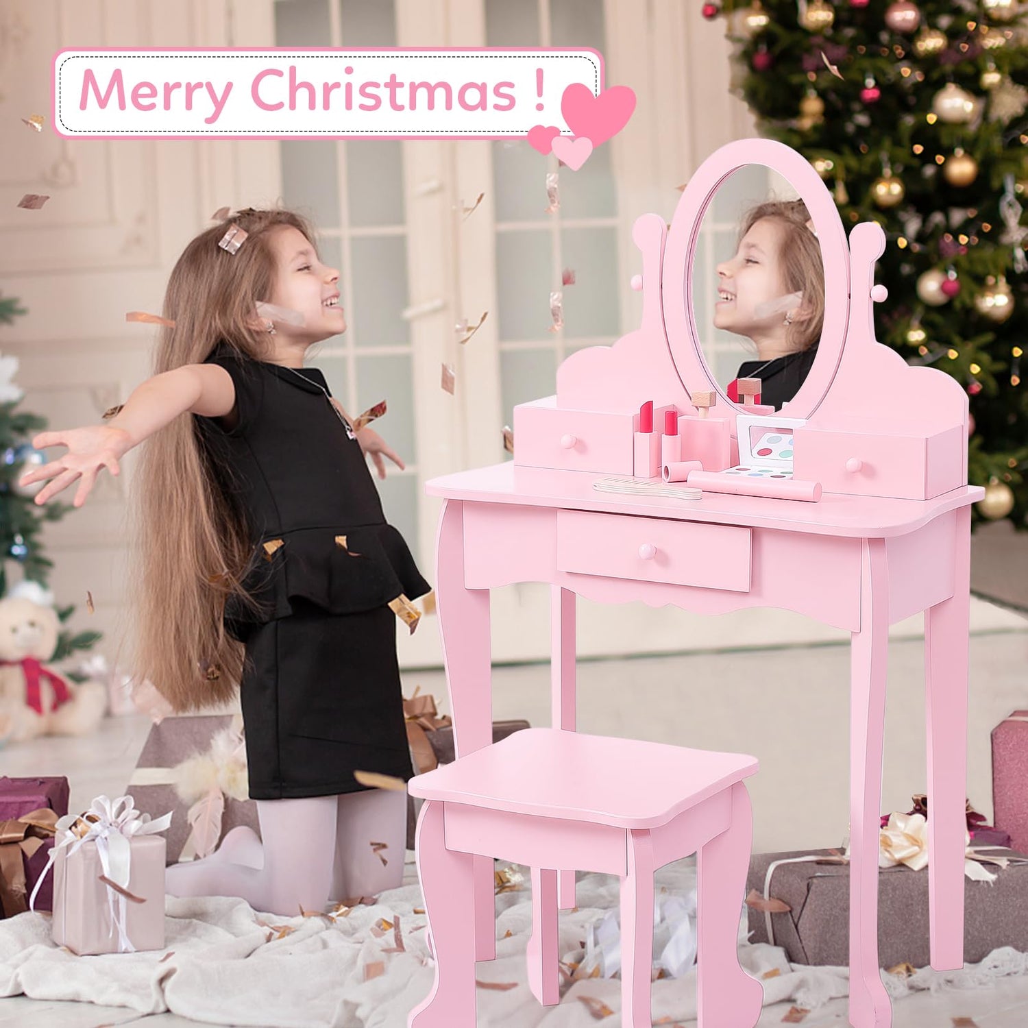 GarveeHome Kids' Vanity Set with Mirror, Makeup Table and Stool for Girls, Vanity Desk and Chair with Wood Makeup Playset for 4-9 Girls, Pink