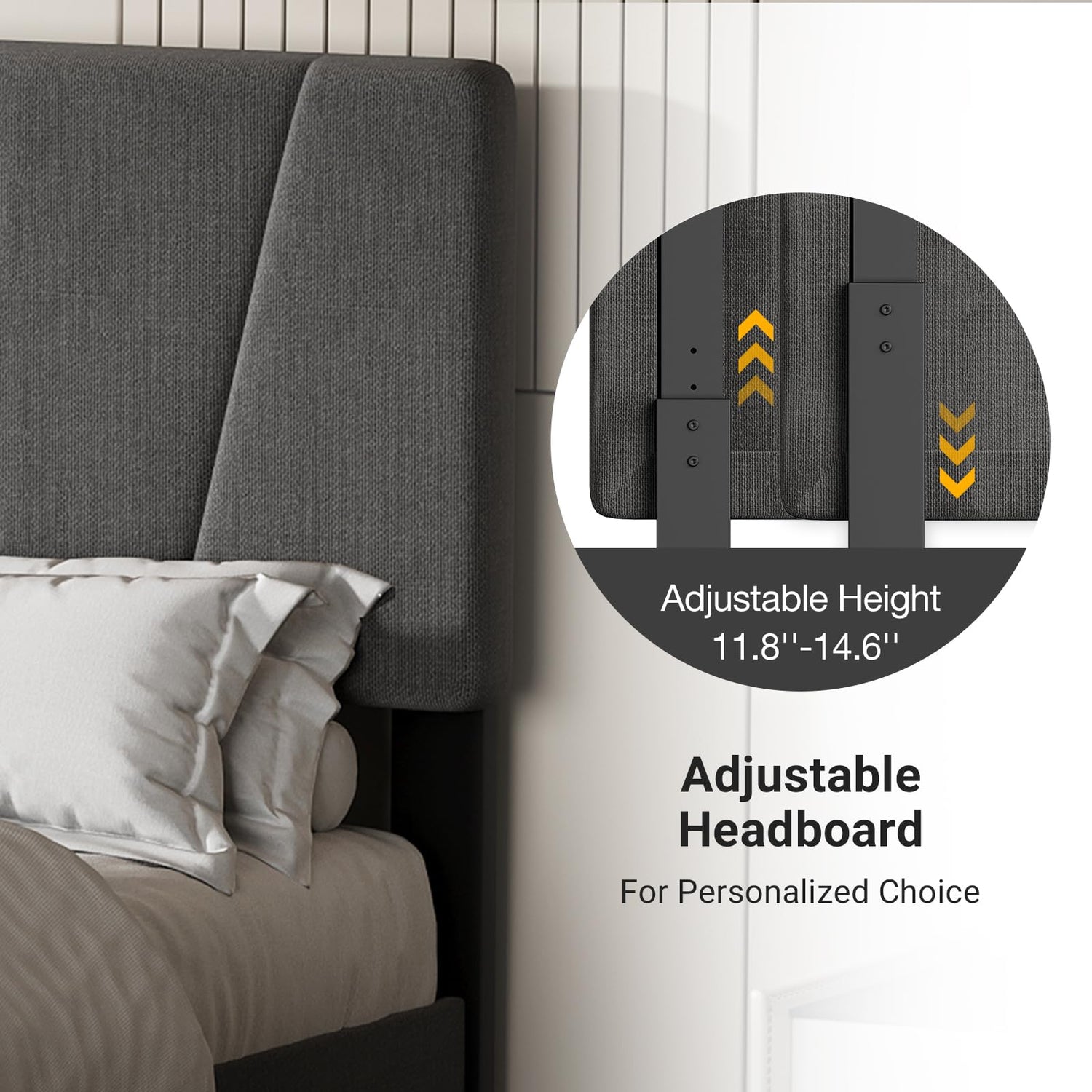 - Adjustable Headboard for Custom Comfort: Featuring an adjustable headboard that ranges from 42.9 to 45.7 in in height, this king bed frame accommodates mattress thicknesses between 8 and 14 in. Tailor the headboard to your preferences for added comfort and style