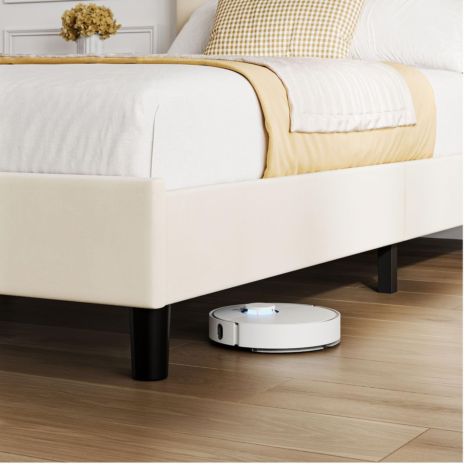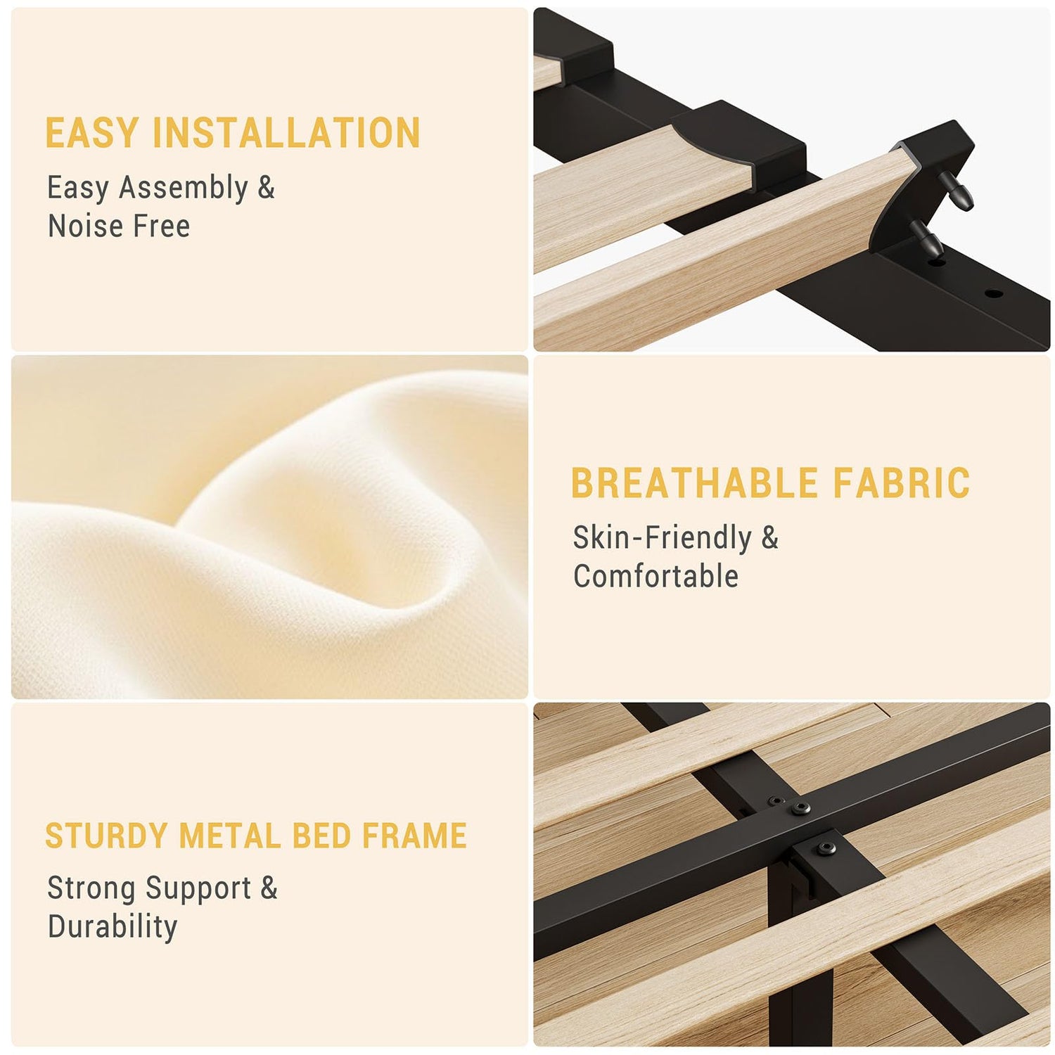 - NOISE-FREE DESIGN: With no need for a box spring, our King size bed frame not only saves you costs but also reduces noise. The use of wooden slats with rubber pads significantly minimizes metal friction noise, providing you with a quiet and comfortable sleeping environment.