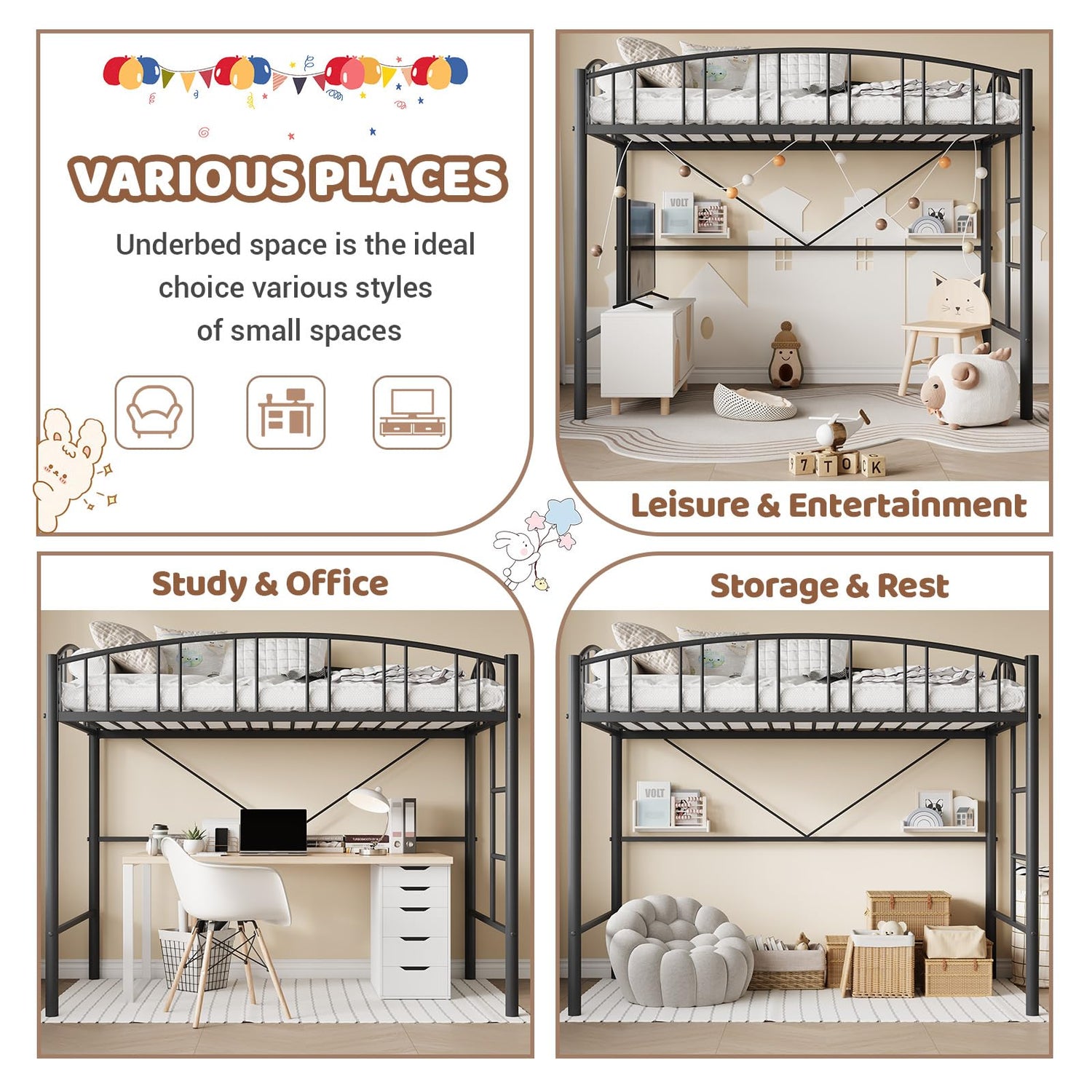 GarveeHome Loft Bed Twin Size, Heavy Duty Metal Loft Bed Frame with Arched Guardrail and Safety Ladder, Space-Saving, No Box Spring Needed, Modern Black