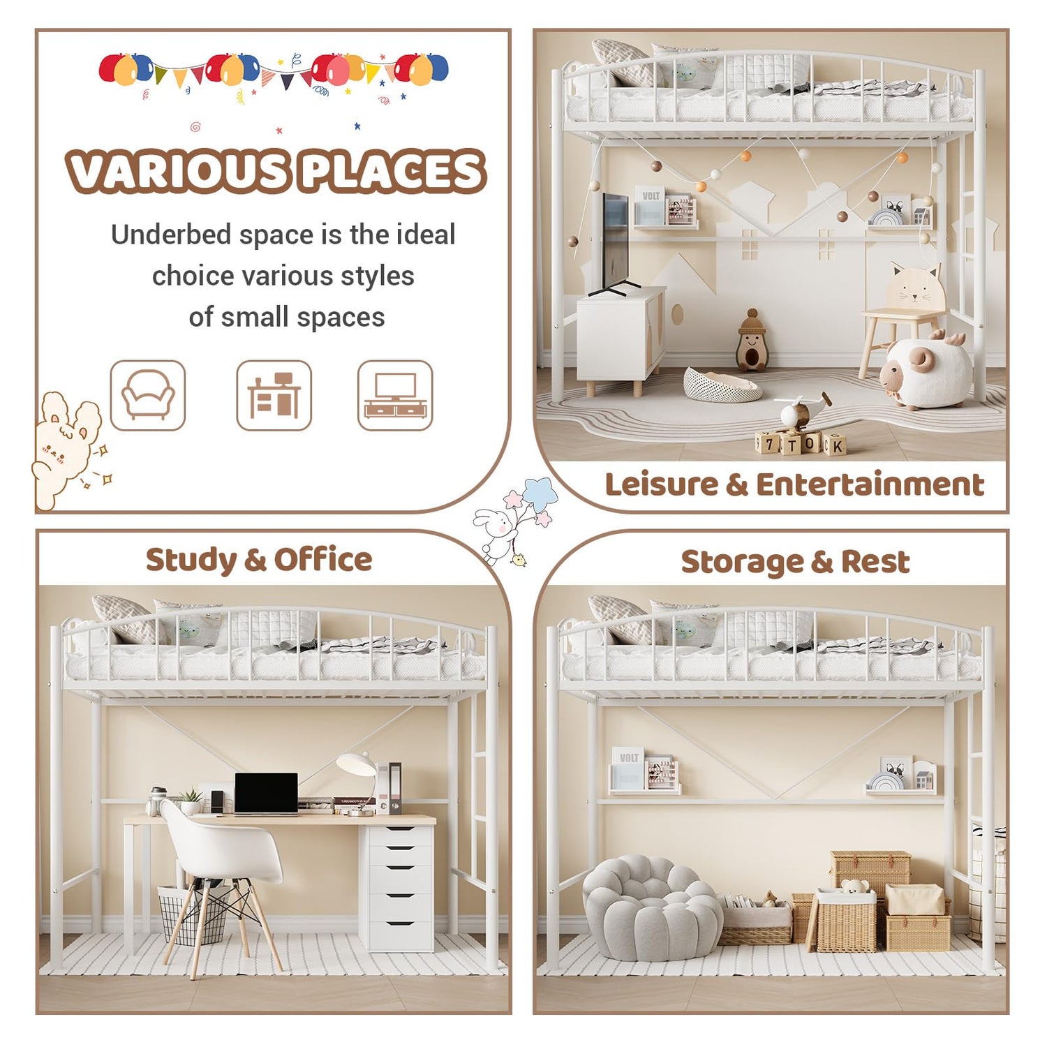 GarveeHome Loft Bed Twin Size, Heavy Duty Metal Loft Bed Frame with Arched Guardrail and Safety Ladder, Space-Saving, No Box Spring Needed, Modern White