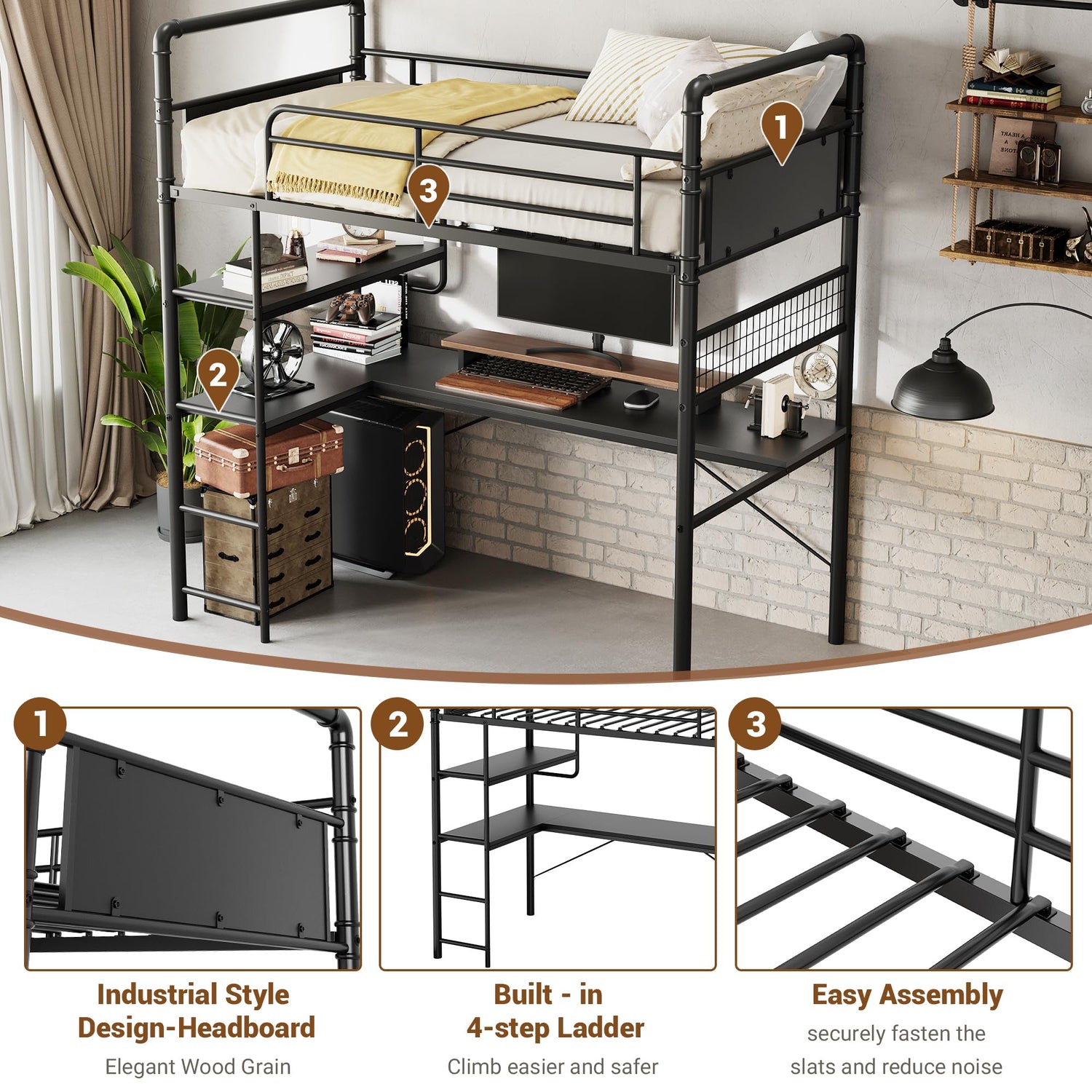 - 【Space-Saving Vintage Bunk Bed】The metal bunk bed features two separate areas, including a twin-size top bunk and an L-shaped desk. This design optimizes vertical space, making it ideal for maximizing room space in children's rooms, guest rooms, or dormitories.Combining a sturdy metal frame with vintage wood accents, this bed exudes a minimalist and industrial charm that effortlessly complements any interior decor style.