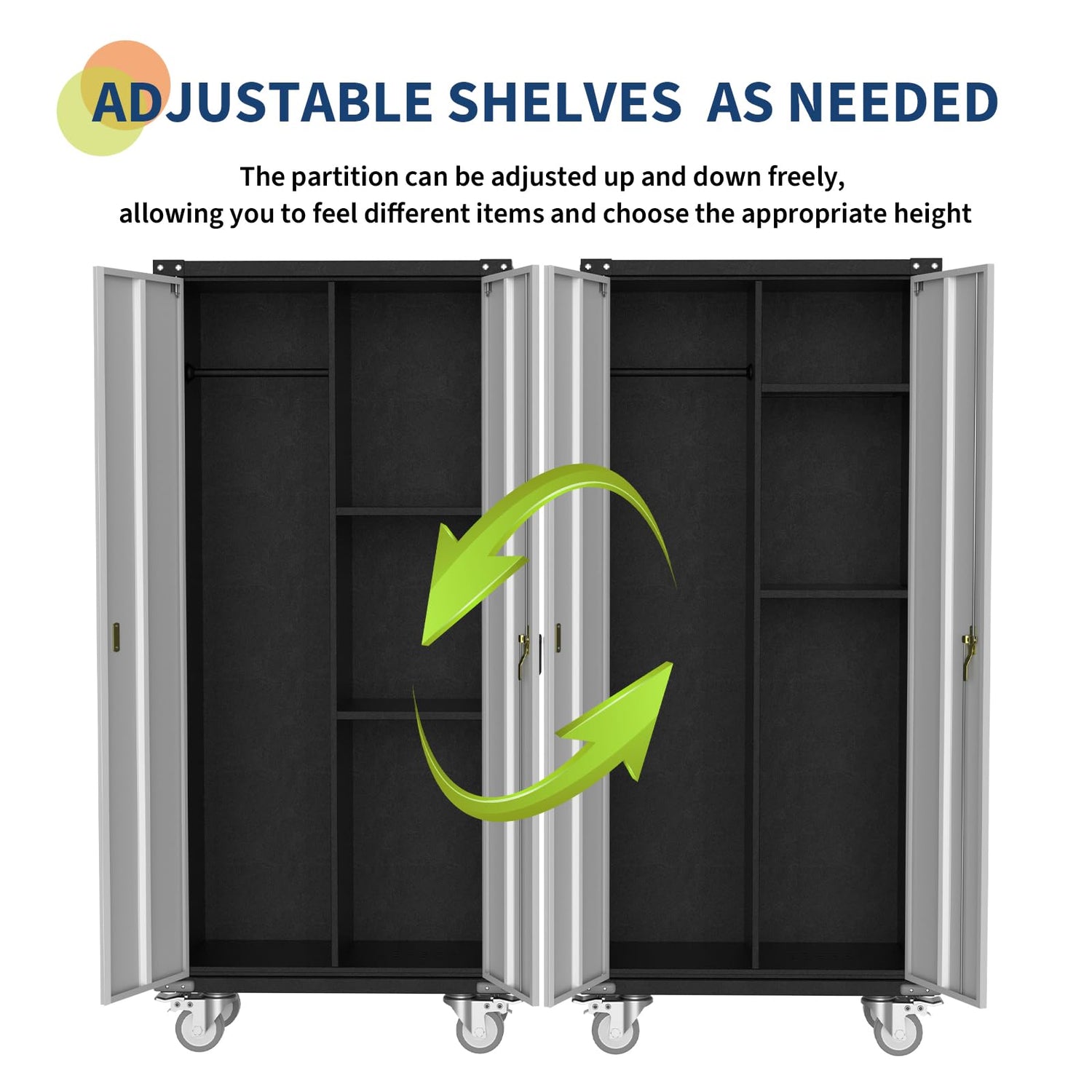 GarveeHome Metal Storage Cabinet 71 in Metal Wardrobe Cabinet on Wheels with Locking Doors Tall Garage with Hanging Rod, Broom Closet, Freestanding Bathroom Storage Cabinet, Cleaning Tool