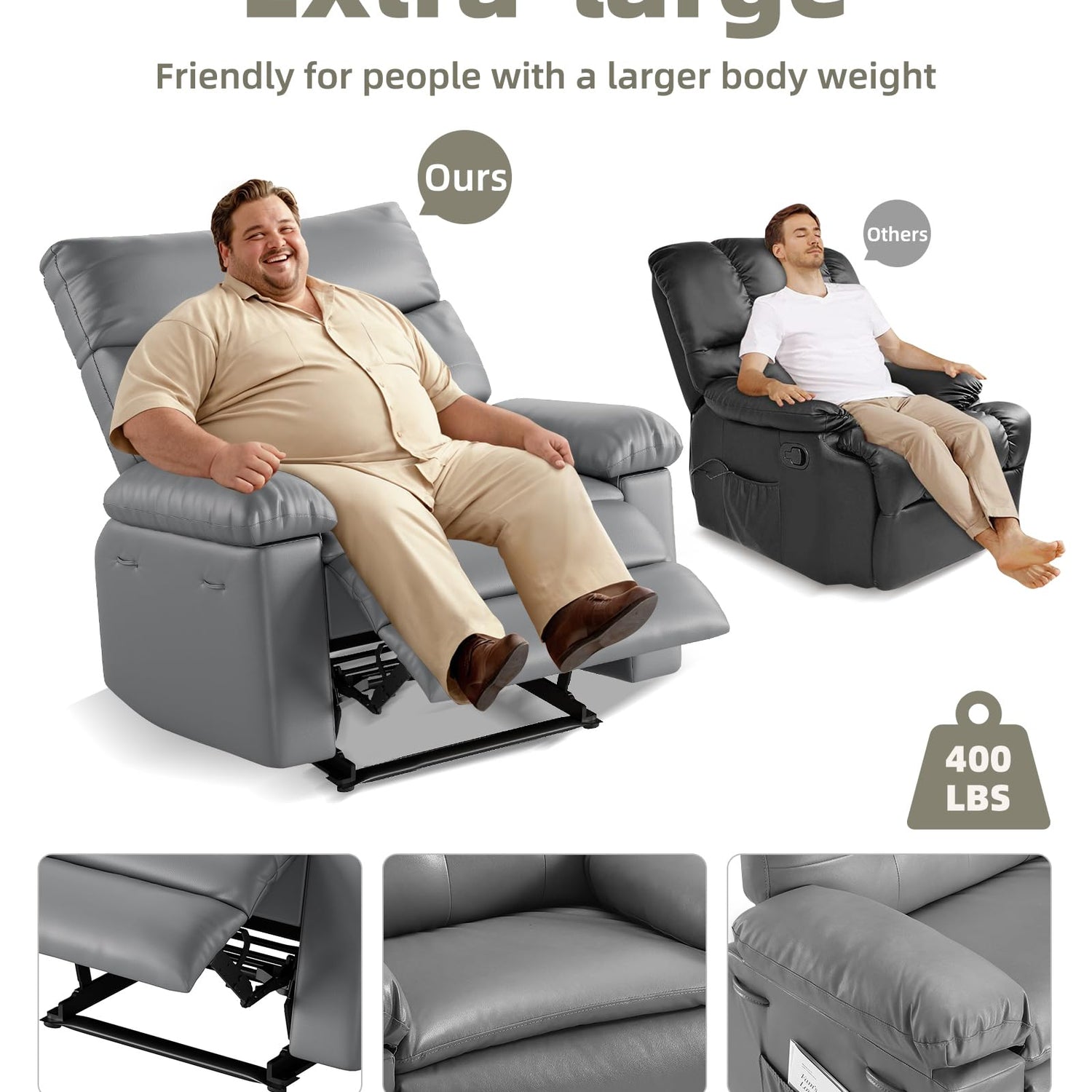 - 【Large Size】 This recliner boasts a spacious seat 27 in wide; Reclines to 150°, supports up to 400 LBS; Fits big guys better (up to 6 ft 2 in )