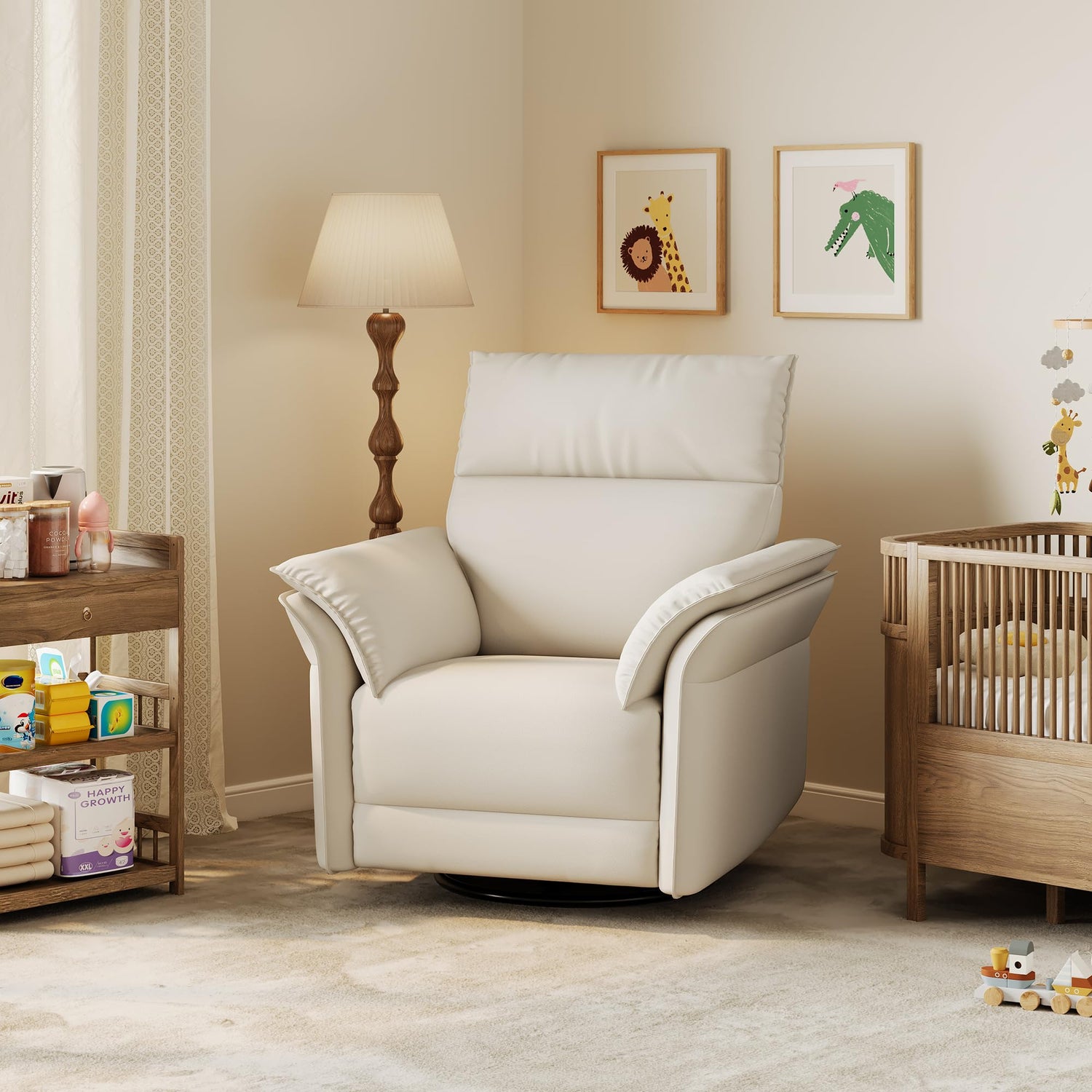 - Unmatched Durability: Built to last, this swivel rocking glider recliner chair is equipped with metal base, and supports up to 350 LBS. Its sturdy construction ensures long-lasting stability and reliability, making it more than just a nursery chair.The surface material is PU Leather, which is not only beautiful but also easy to clean.