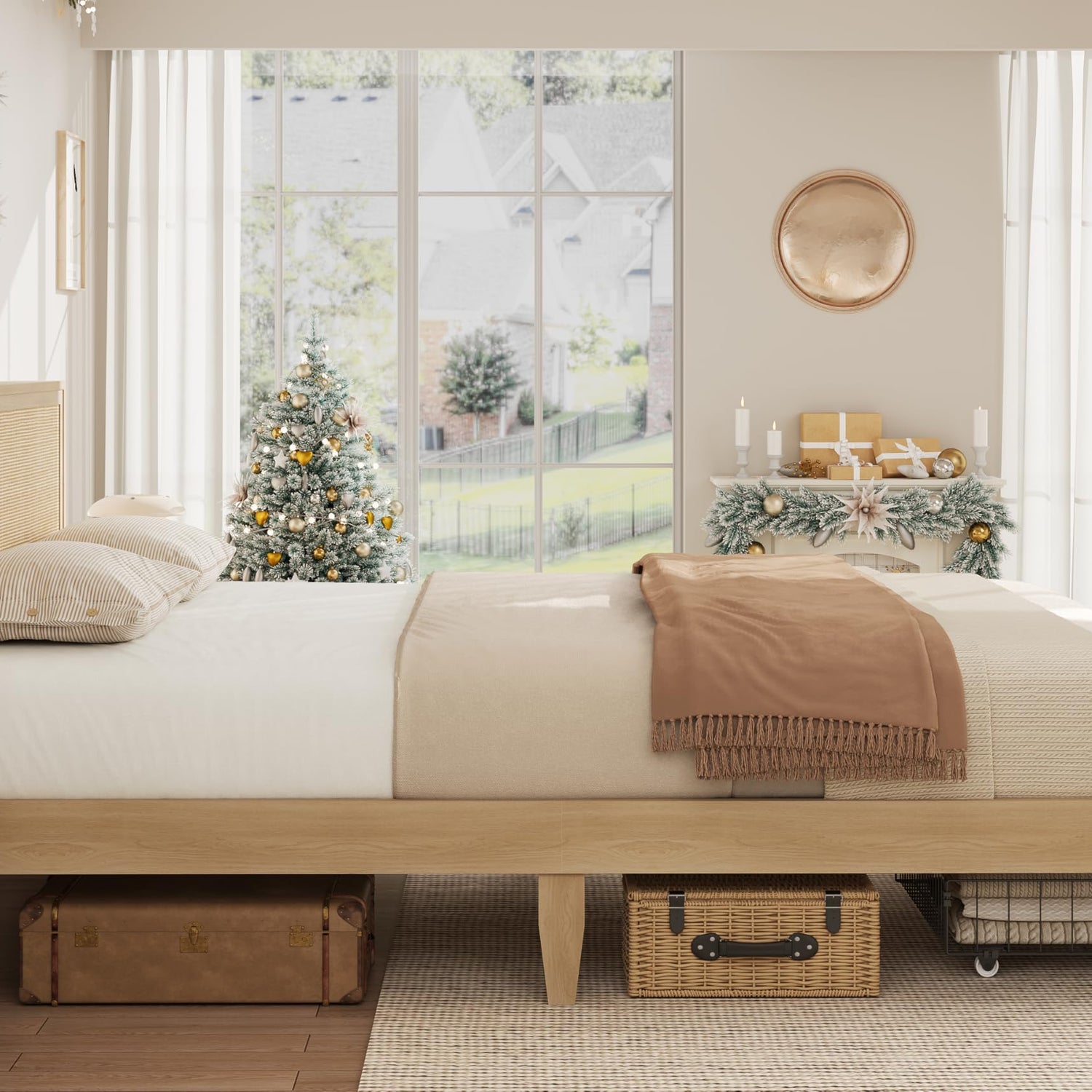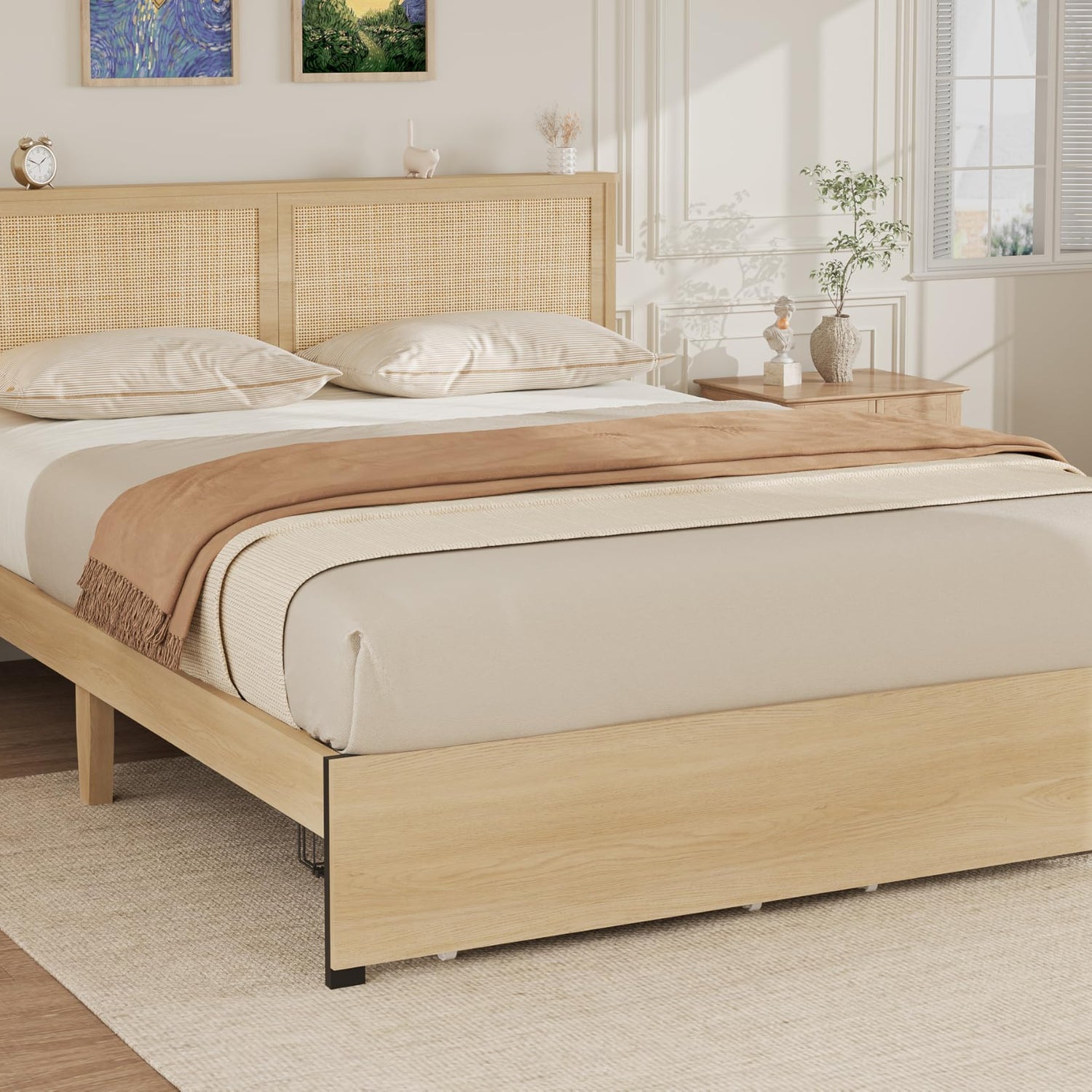 - Convenient Under-Bed Storage: The cane bed frame includes two under-bed storage drawers with upgraded wheels for smooth accessibility, and their lock hole feature keeps them securely in place to prevent unwanted movement and maintain organization
