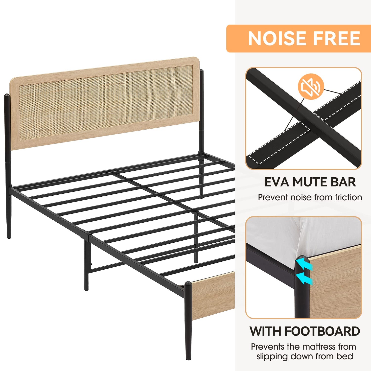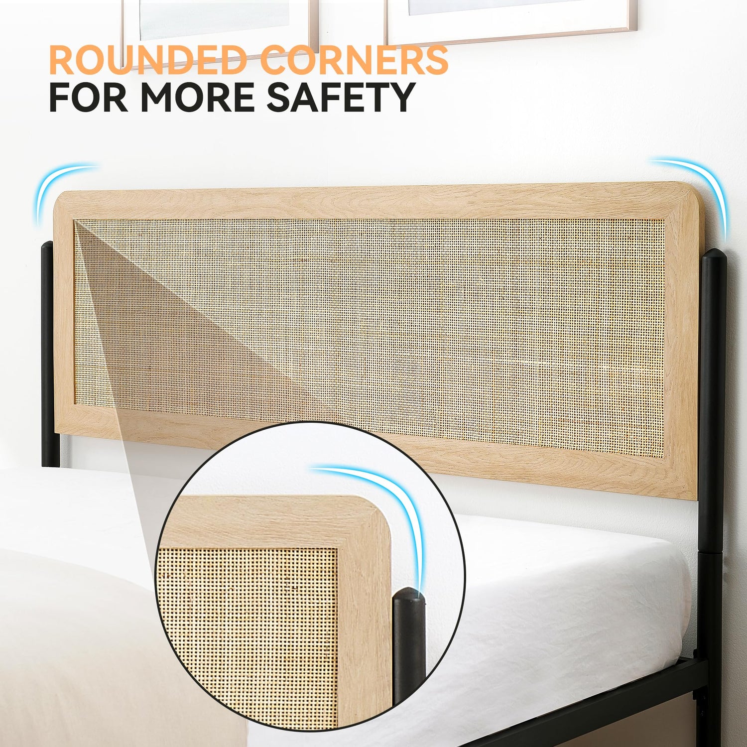 Details: GarveeHome Queen Size Bed Frame with Rattan Headboard, Rattan Queen Platform Bed Boho Style with Strong Metal Slats Support, Under Bed Storage, Noise-Free, No Box Spring Needed, Light Oak