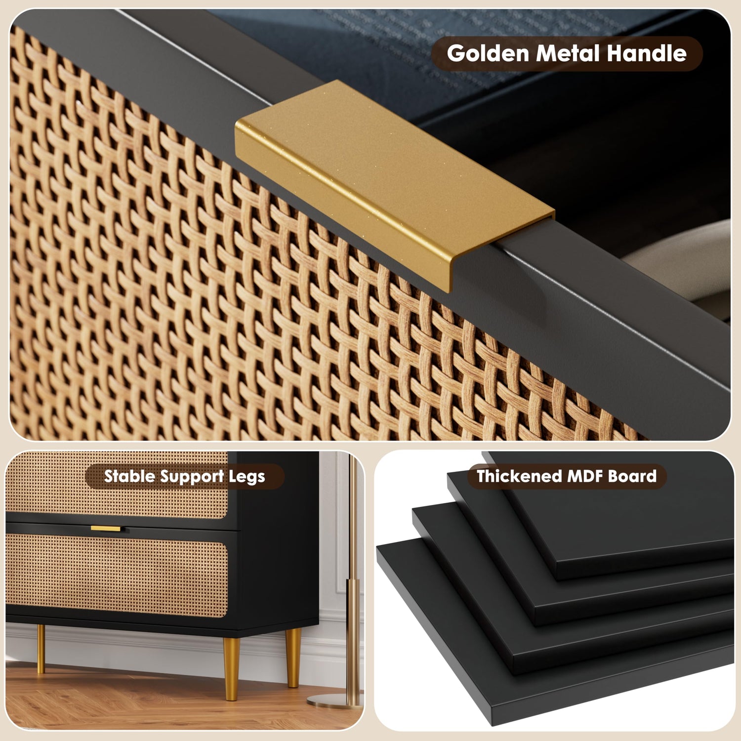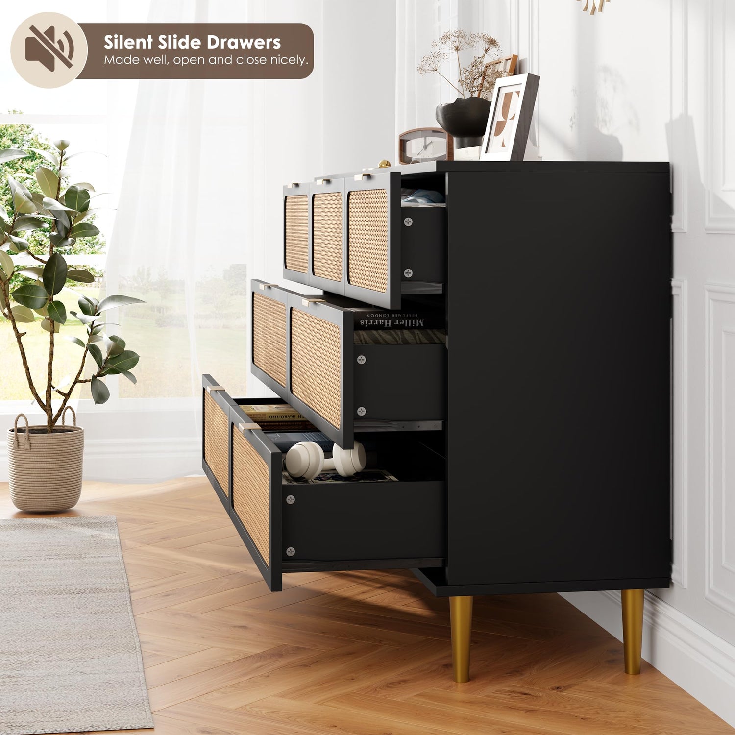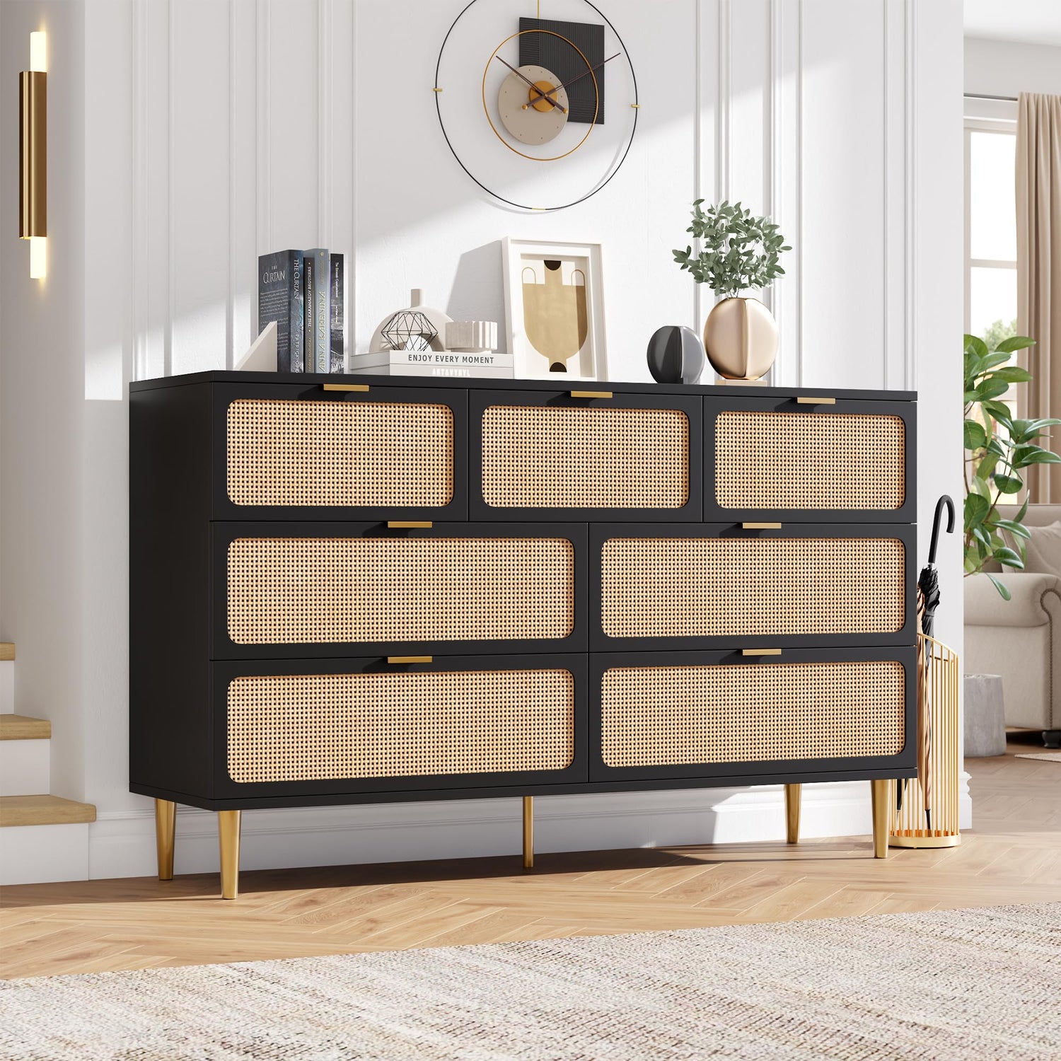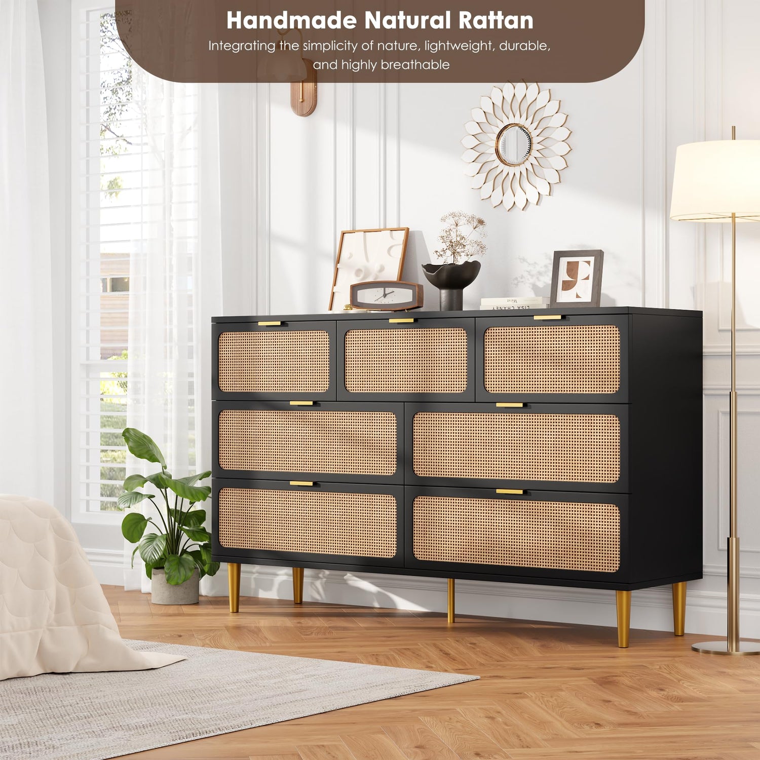 - Unique Natural Rattan Dresser: 7 drawers dresser for bedroom with a simple design, and natural rattan doors skilled craftspeople have woven the product by hand. The natural beauty of the rattan gives each bedroom dresser a unique expression and also keeps rattan dresser airiness and strengthening damp-proof, bringing a piece of nature into your home.