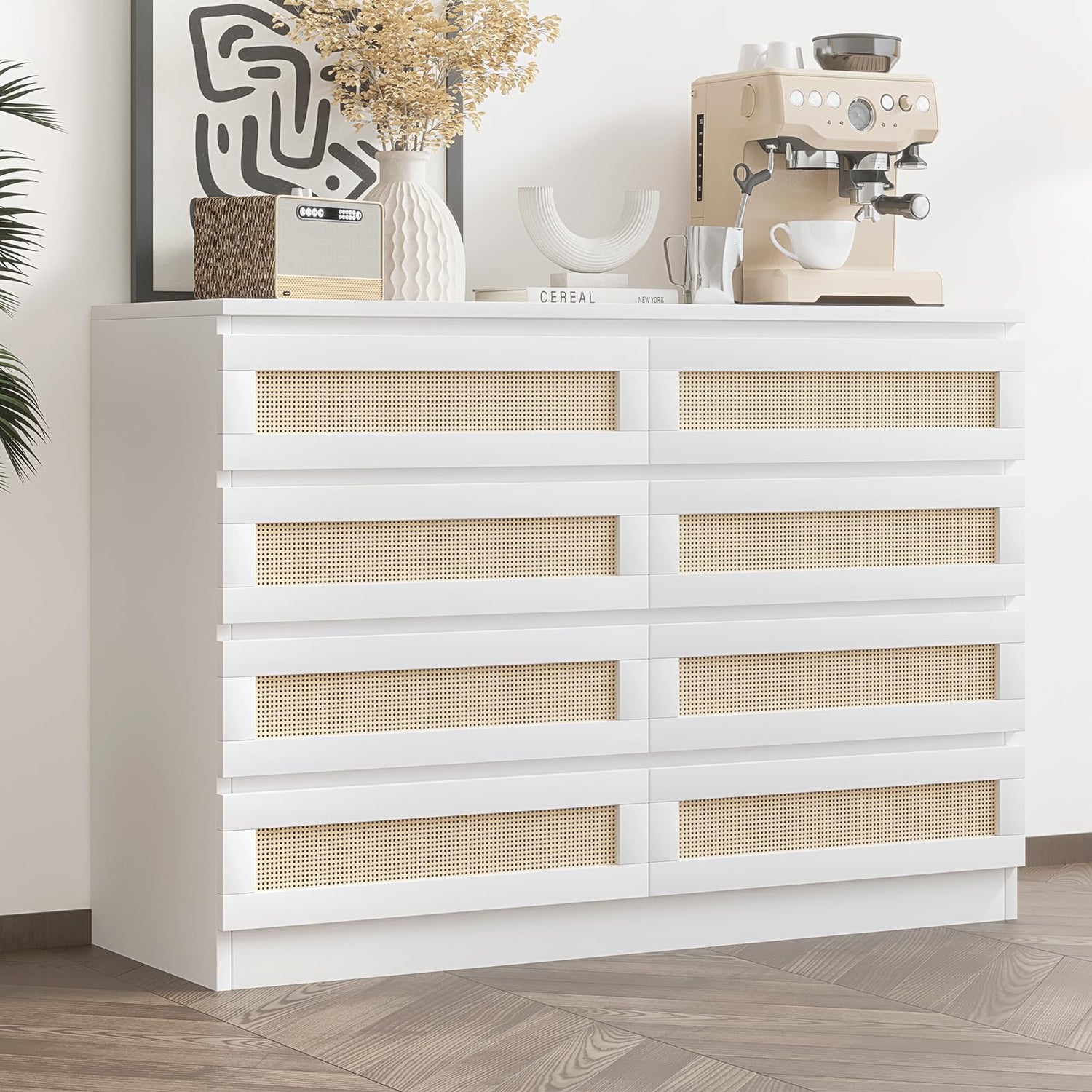 - Clutter-Free Living: Maximize storage with eight spacious drawers (47.24 x 13.07 x 33.70 in), perfect for organizing clothes, accessories, and household items. This rattan dresser keeps your space tidy while allowing easy access to your belongings
