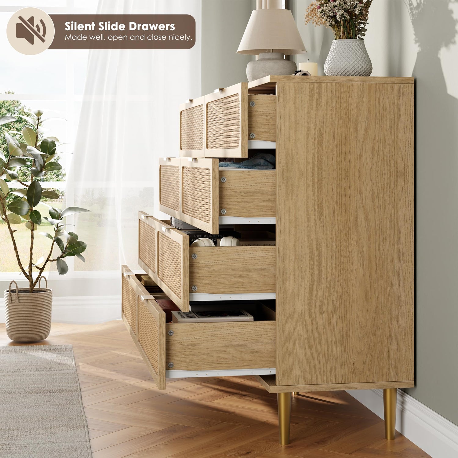 - Unique Natural Rattan Dresser: 8 drawers dresser for bedroom with a simple design, and natural rattan doors skilled craftspeople have woven the product by hand. The natural beauty of the rattan gives each bedroom dresser a unique expression and also keeps rattan dresser airiness and strengthening damp-proof, bringing a piece of nature into your home.