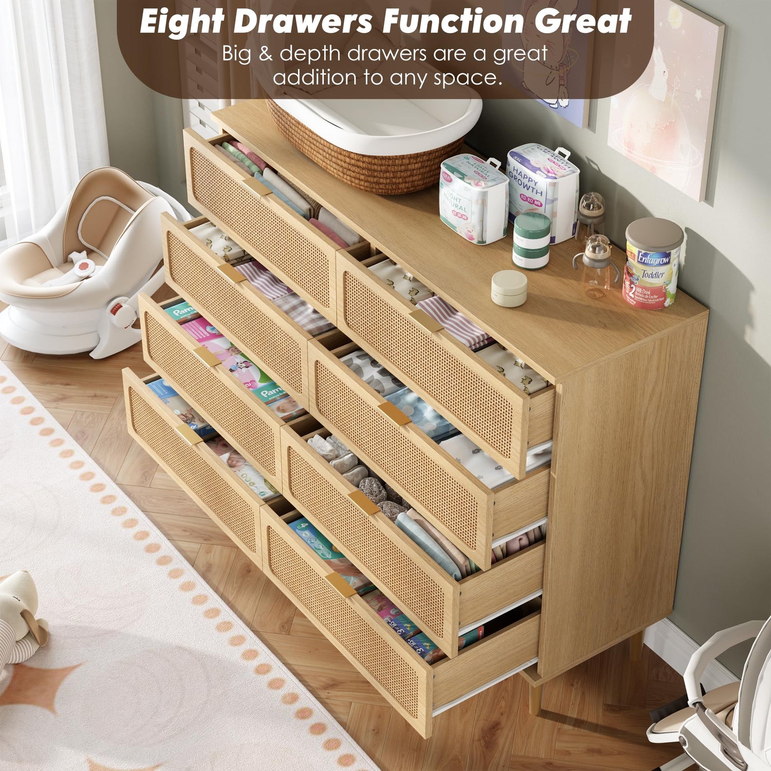 - More Than Big: A natural wooden color gives the chest of drawers an elegant look. Wide top and 8 deep drawers give wooden dresser a practical storage function, and smooth-running drawers can accommodate more clothes, making rattan dresser tall easy for you to sort the items.