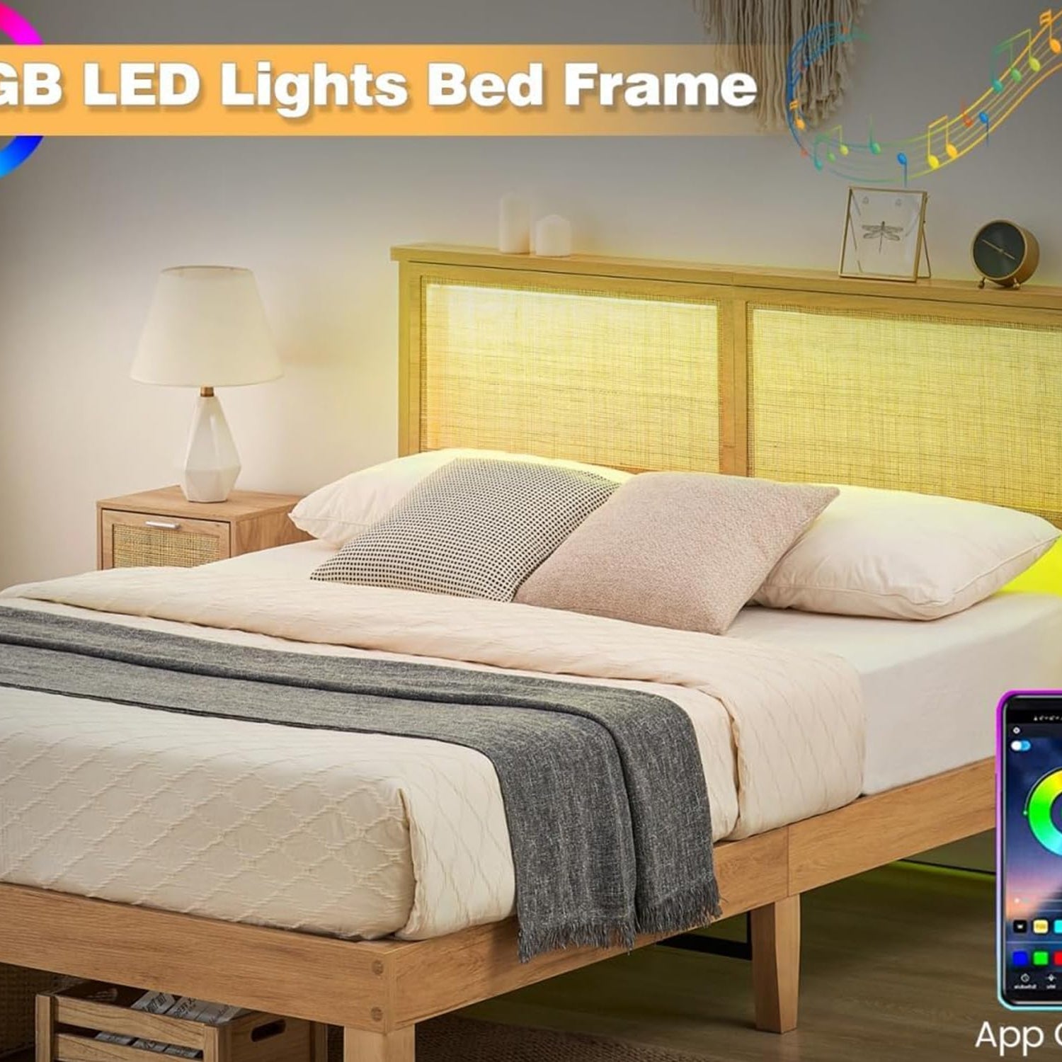 - Versatile RGB LED Lights: The rattan queen bed frame comes with REG LED lights controlled by a remote, offering various options such as colors, mic mode, music mode and a timing function. You can adjust them as desired, creating an optimal sleep or relaxation ambiance for you.