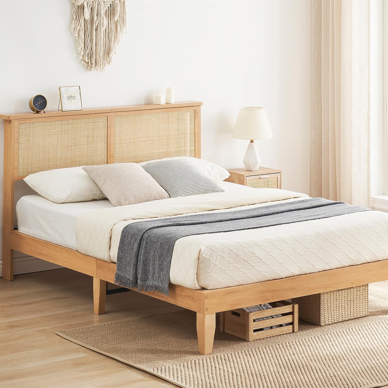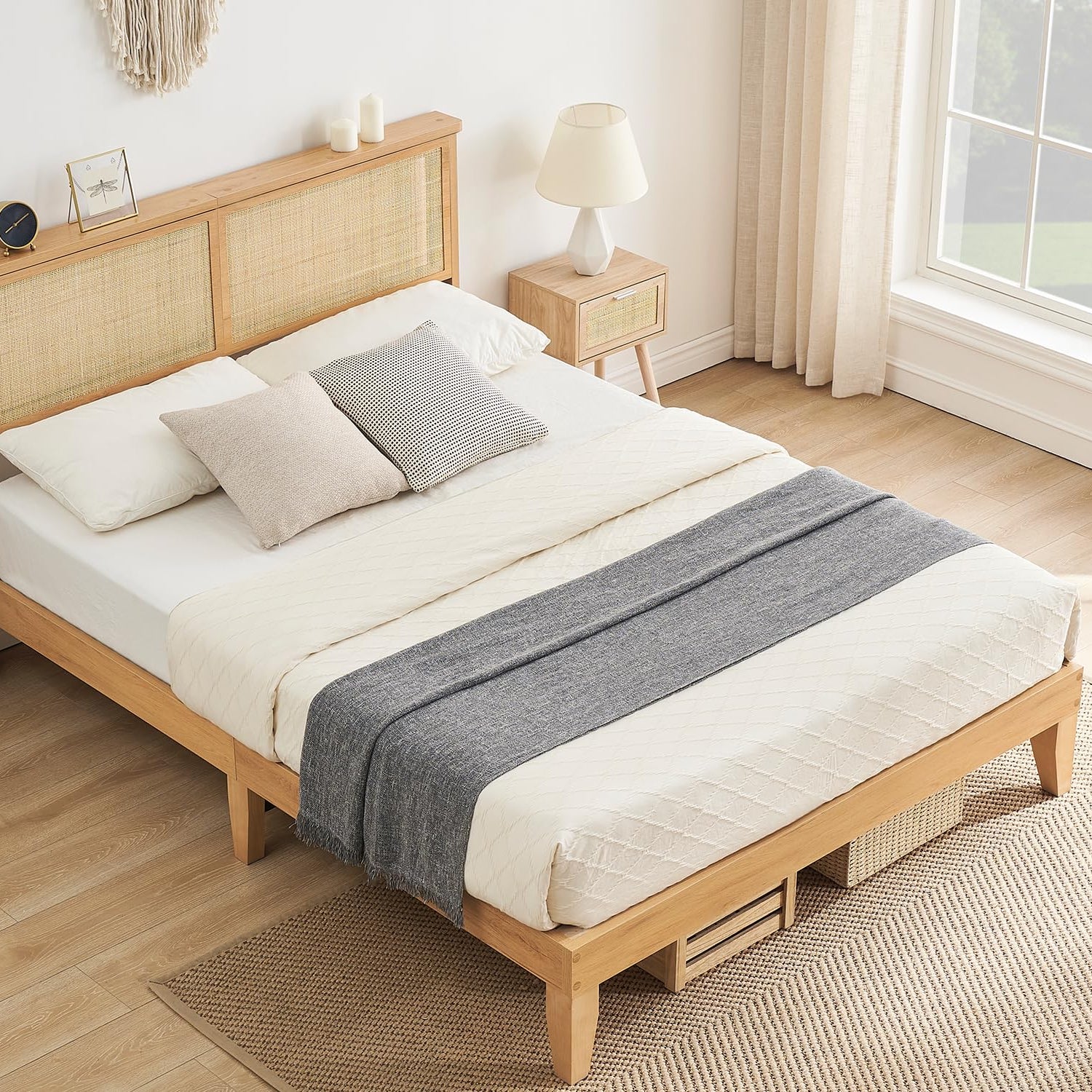 - Ample Storage Capacity: The wooden headboard offers a convenient area to place small items like glasses, alarm clocks and phones. And the queen rattan bed frame is 8 inches above the ground, you can utilize to store boxes, suitcases and other belongings, maximizing room space.