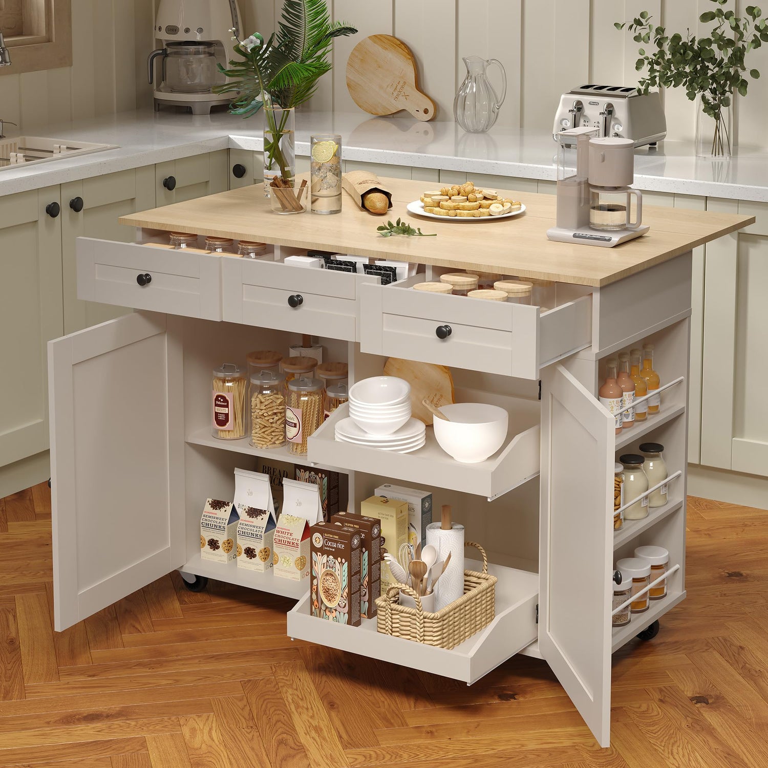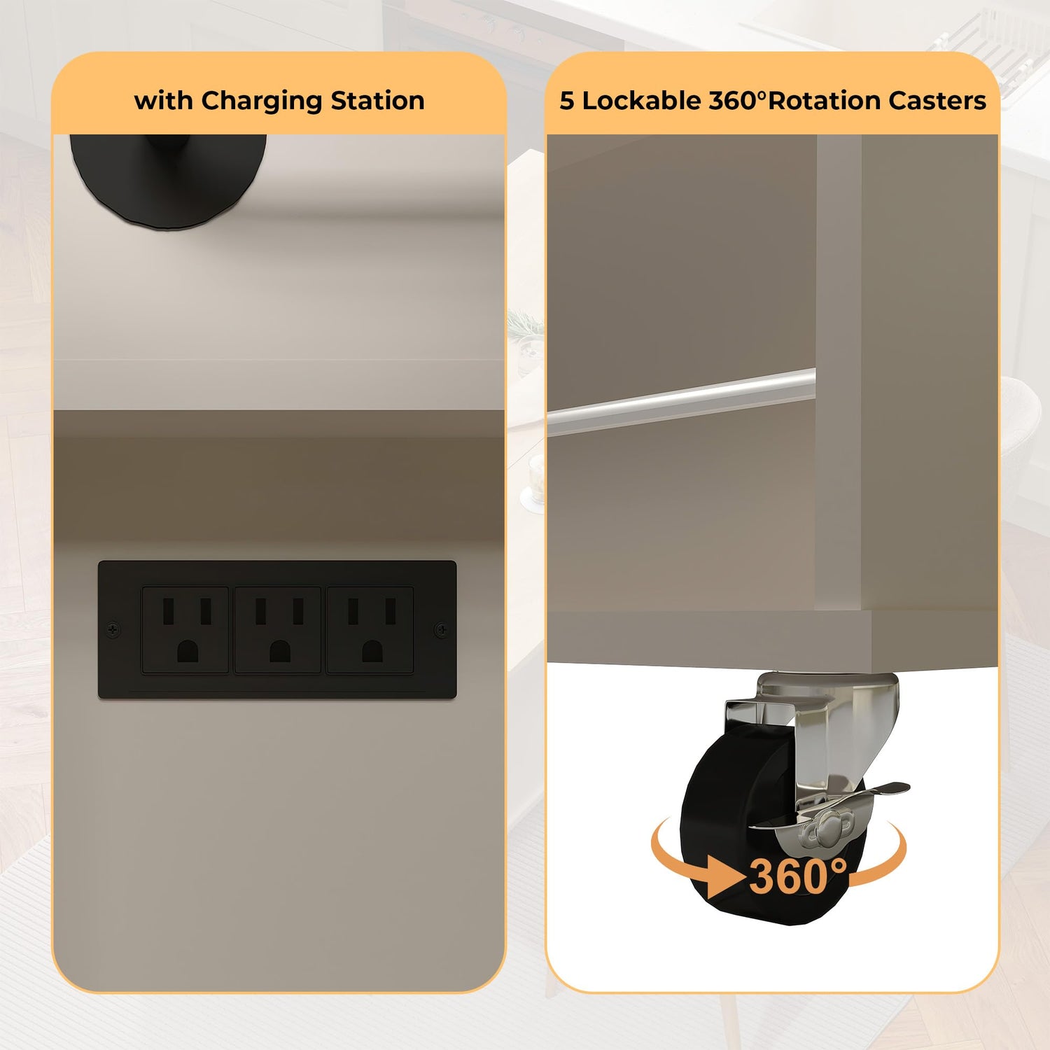 - 【Built-in Charging Station】Equipped with 2 AC power outlets and 2 USB-A ports, this island cart offers a seamless charging solution for your coffee maker, microwave, toaster, and other kitchen devices while conveniently charging your phone. Streamline appliance operations and boost productivity in your culinary space.