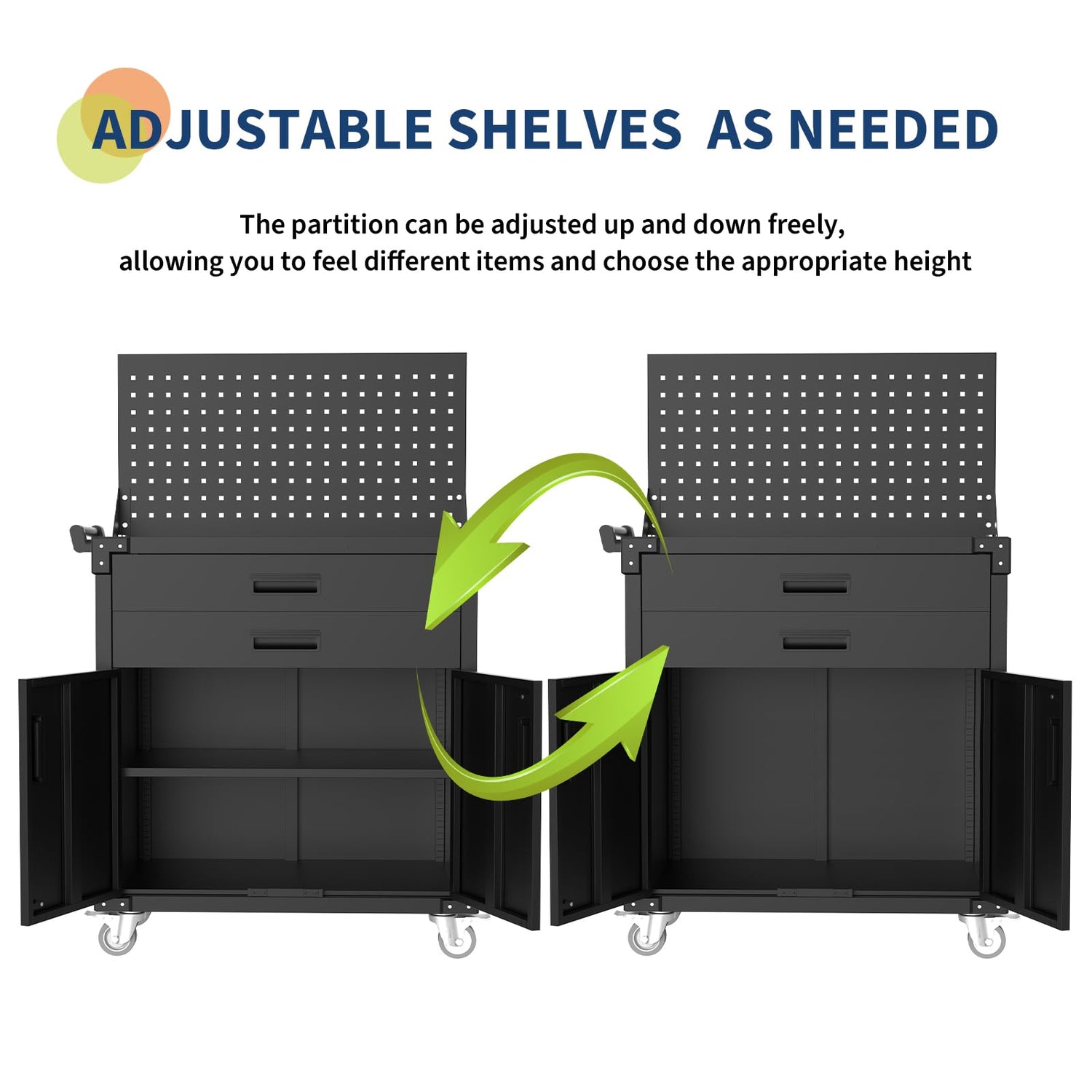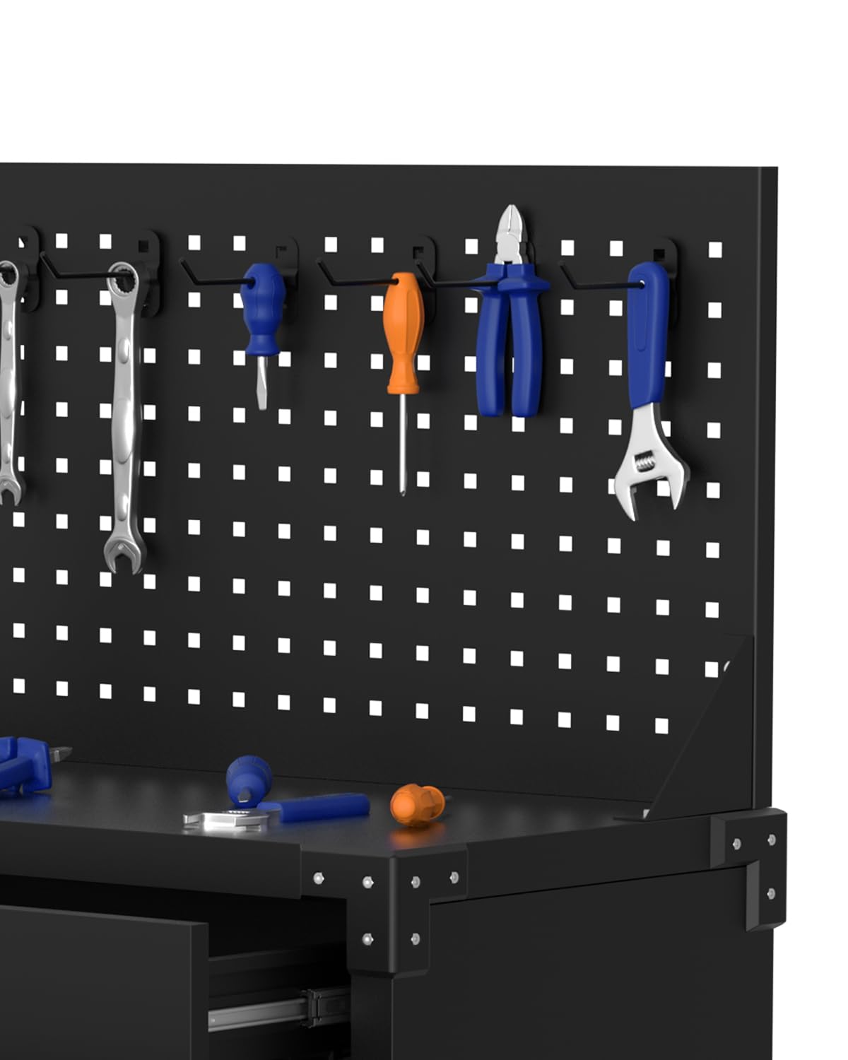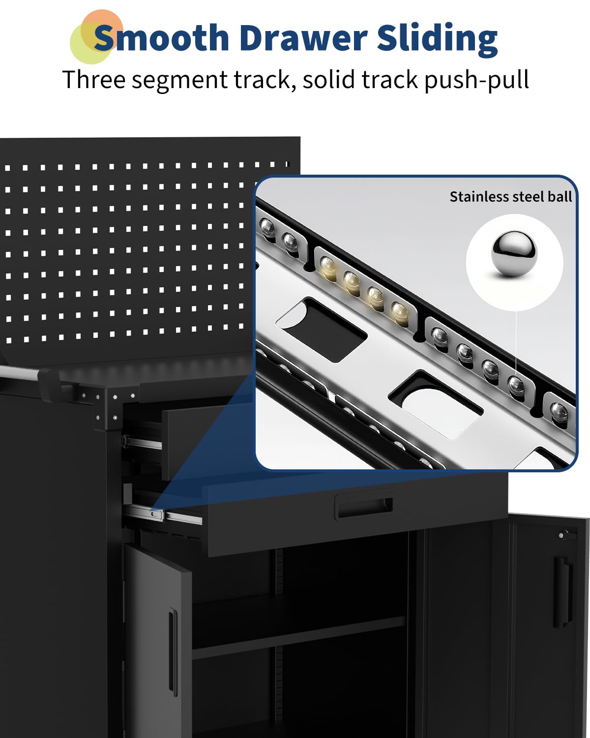 - --Organized & Spacious: Two smooth-glide drawers, a full-width interior shelf, and a large pegboard make it easy to organize wrenches, hardware, and accessories. The wide tabletop on this garage storage cabinet offers extra work and storage space
