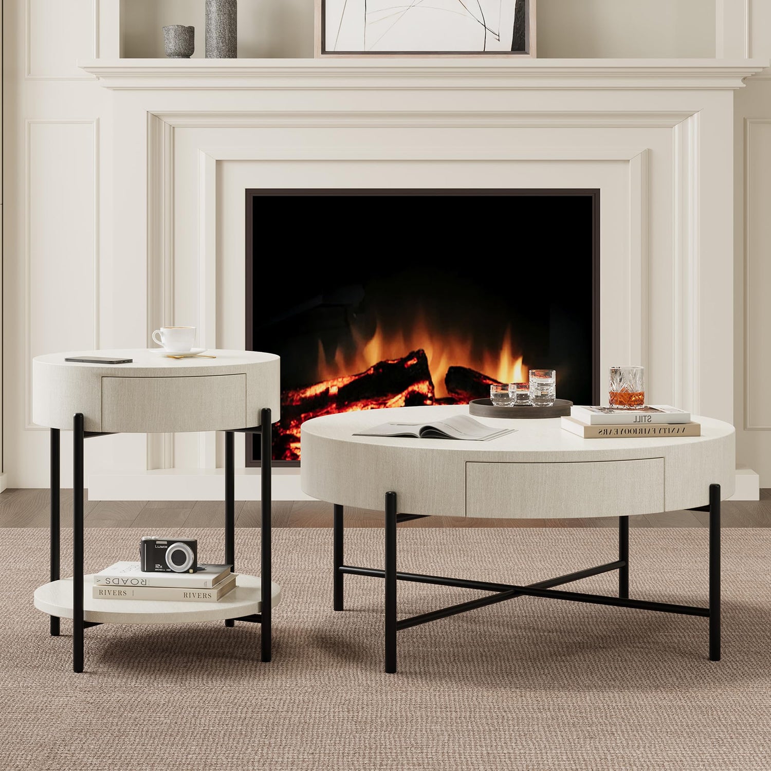 GarveeHome Round Coffee Table with Drawers Circle Living Room Table Wood Accent Coffee Table with Storage White Center Table