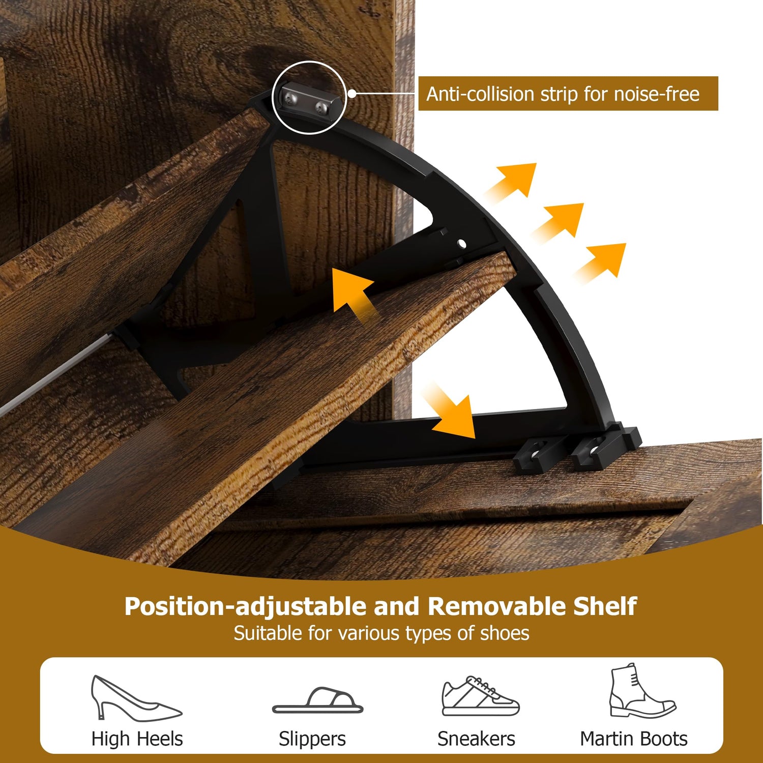 - [ Large Capacity Shoe Cabinet ] - The shoe storage cabinet can hold a maximum of 32 to 40 pairs of shoes. On the left side, there are three flip drawers, each with two storage compartments. The panel can be adjusted or removed in two positions within two grooves to accommodate different heights and sizes of flats, ankle boots, or high heels. On the right side, there are two adjustable shelves for storing women's knee-high boots or other items.
