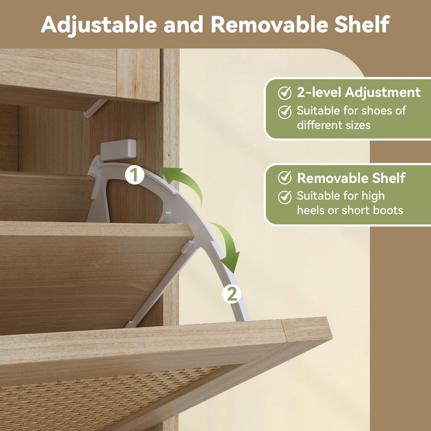 - [FUNCTIONAL AND SAFE ORGANIZER] Elegance meets practicality in our shoe organizer, which seamlessly integrates into any living room, bedroom, or entryway. Safety is a top priority, and this cabinet comes with an anti-tipping device to prevent accidents, making it a safe choice for families with children. The adjustable panels in each flip drawer allow you to accommodate various shoe heights, while the removable hook on the side offers convenient storage for umbrellas or bags, enhancing access an