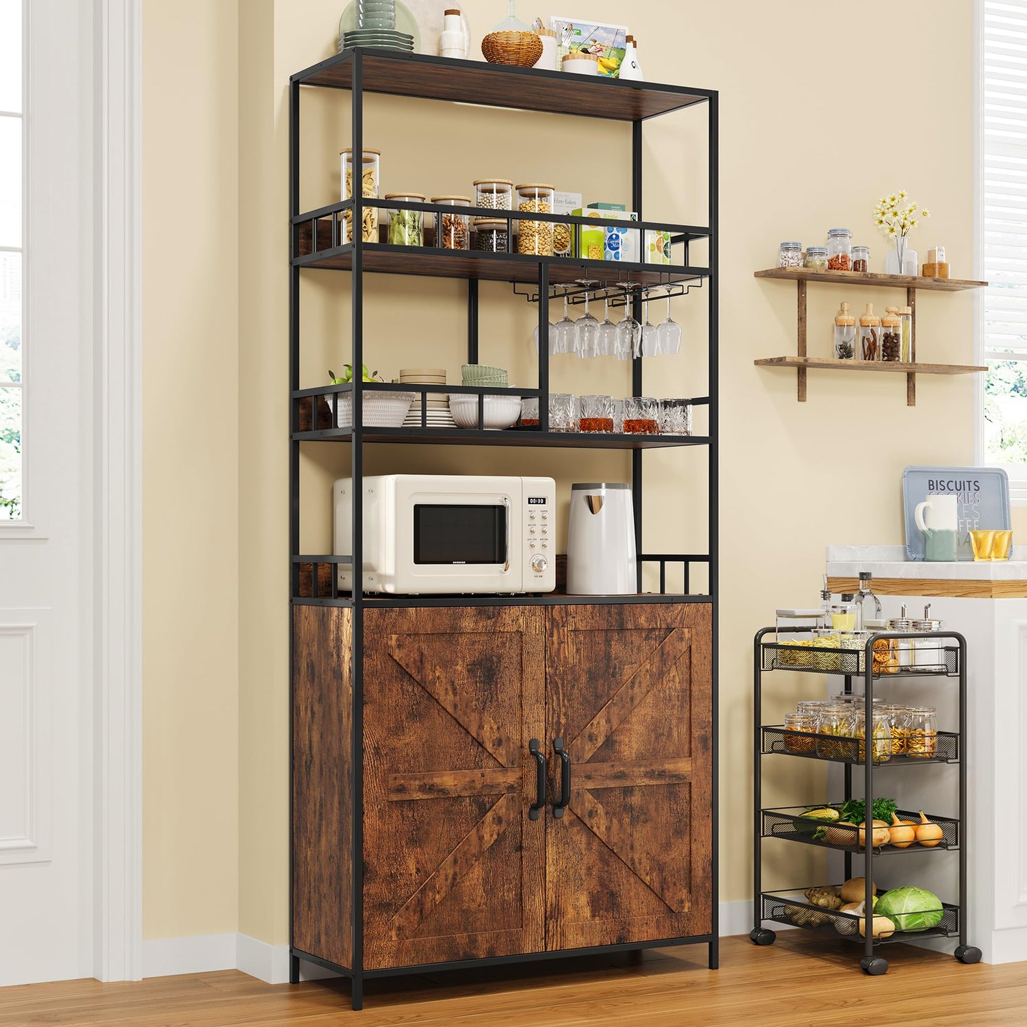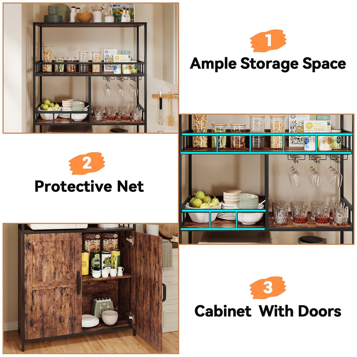 - [Various storage space] Our tall bar cabinet features ample open storage shelves ideal for keeping kitchen appliances easily accessible, along with a smaller open shelf designed for spice bottles and cans. The equipped glass holder offers extra space for placing your goblets. Additionally, this wine rack is equipped with a large cabinet, providing dust-proof storage space for food, dishes, or other Wine bottles.